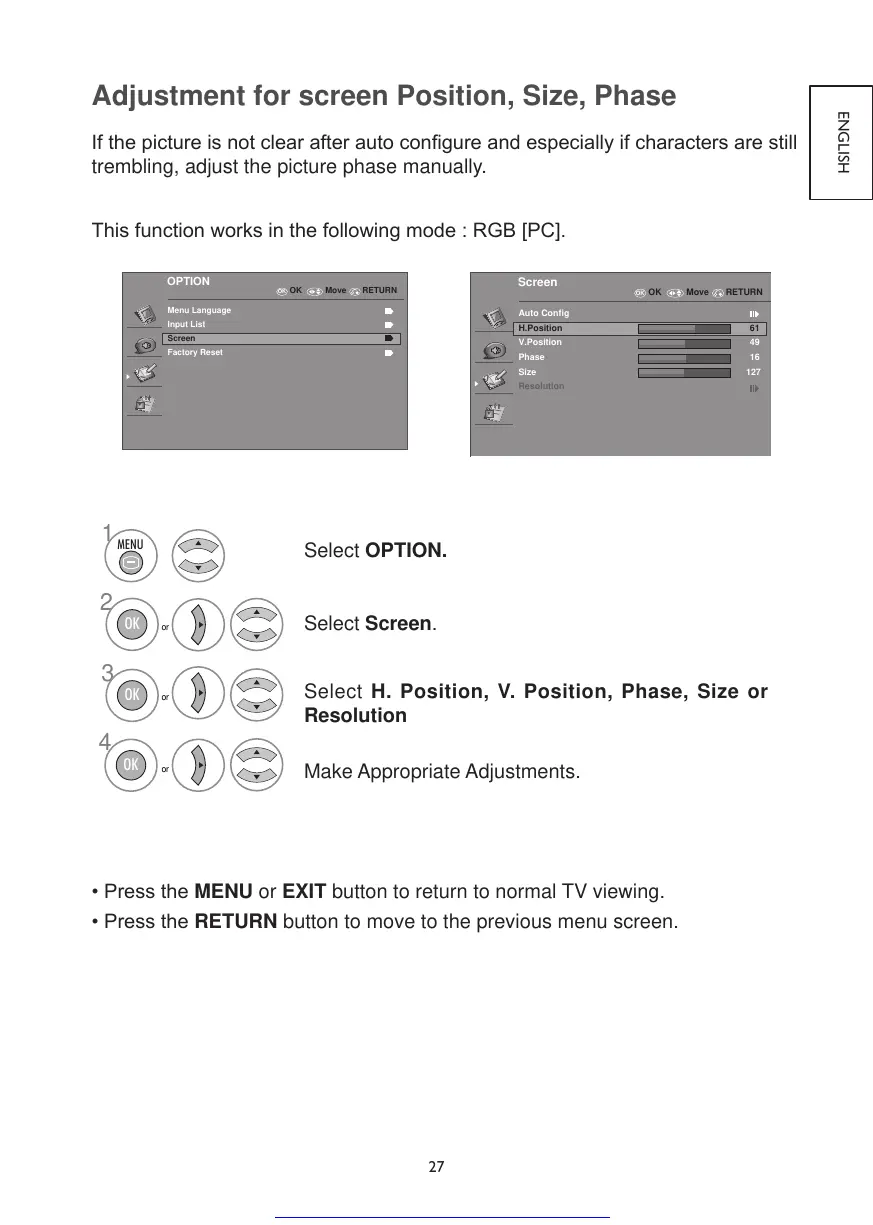 Adjustment for screen Position, Size, Phase