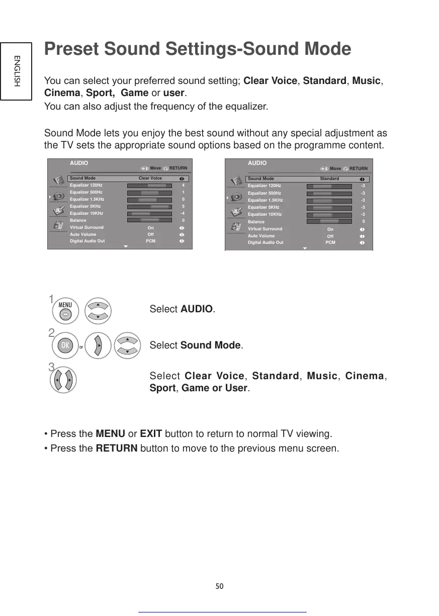 Youcanselectyourpreferredsoundsetting;Clear Voice, Standard, Music,