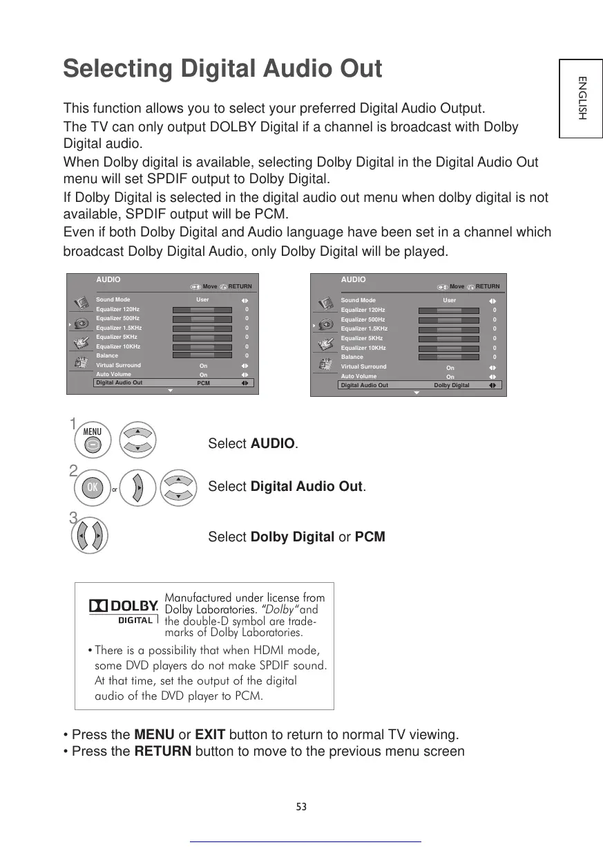 When Dolby digital is available, selecting Dolby Digital in the Digital Audio Out