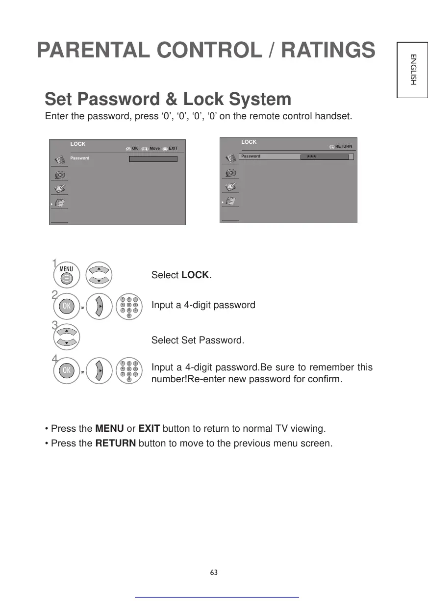 Enter the password, press ‘0’, ‘0’, ‘0’, ‘0’ on the remote control handset.