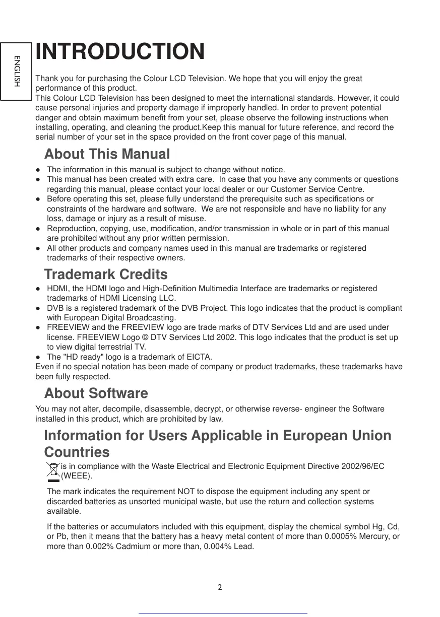 Thank you for purchasing the Colour LCD Television. We hope that you will enjoy the great
