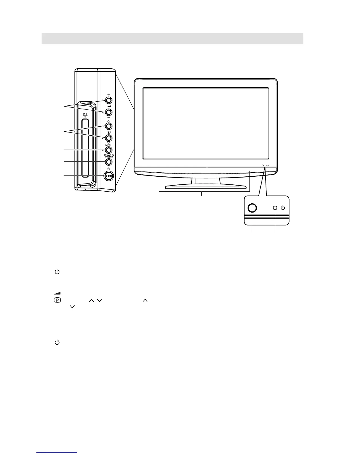 7. TV/AV/PC/ENTER button: Select input mode for TV/AV/COMPONENT/HDMI/PC. In Menu : Using