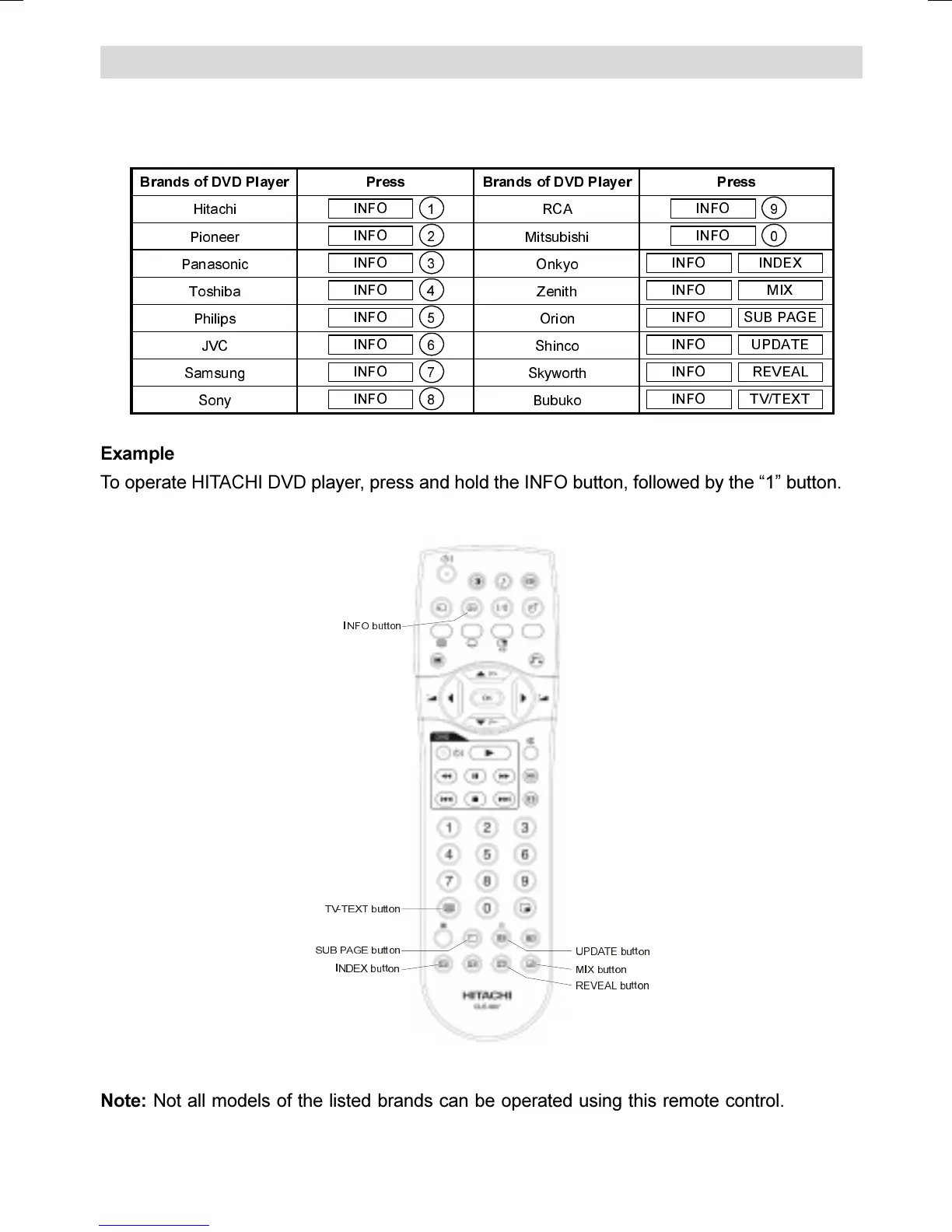 To operate HITACHI DVD player, press and hold the INFO button, followed by the 1 button.