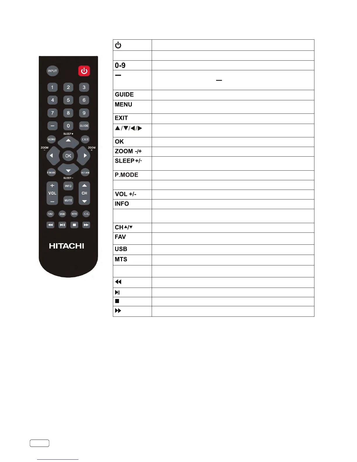 C.C. Press to set Closed Caption to “CC O”, “CC On Mute” or “CC On”.