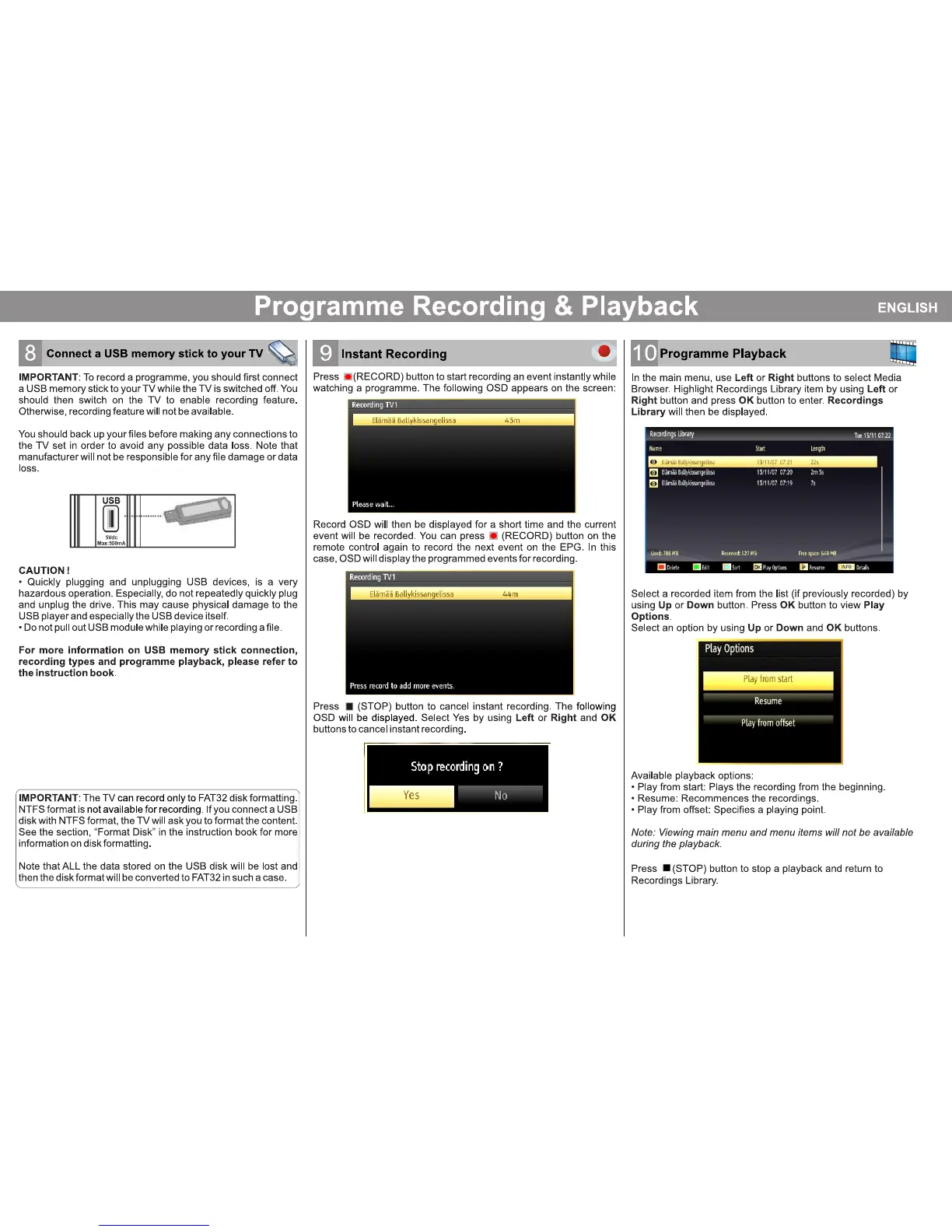 Hitachi 32HBC01 - Programme Recording & Playback; Connect USB Memory Stick; Instant Recording; Programme Playback