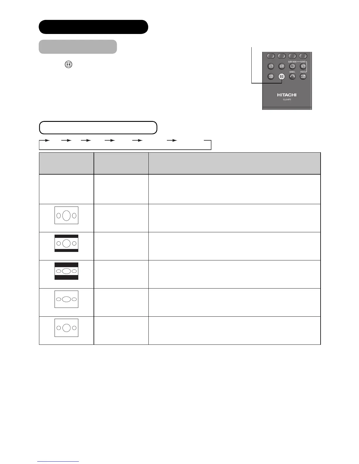 Each time button of the remote control is pressed, the screen display size is