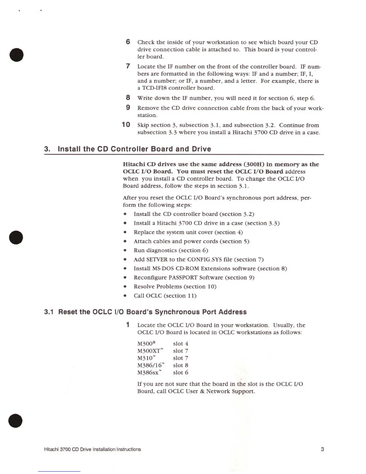 Hitachi 3700 - 3. Install the CD Controller Board and Drive; 3.1 Reset the OCLC I;O Boards Synchronous Port Address