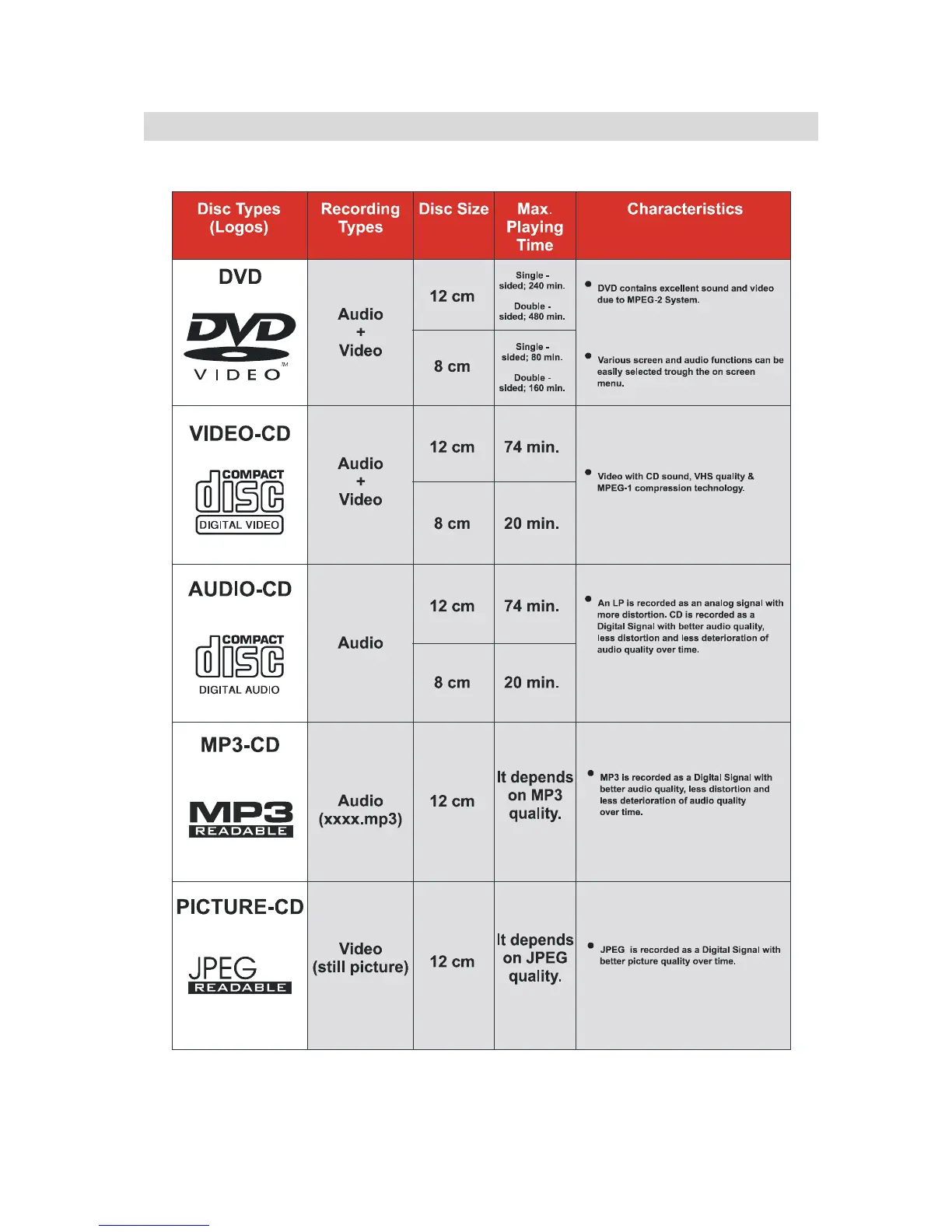 Disc Types Compatible with This Unit