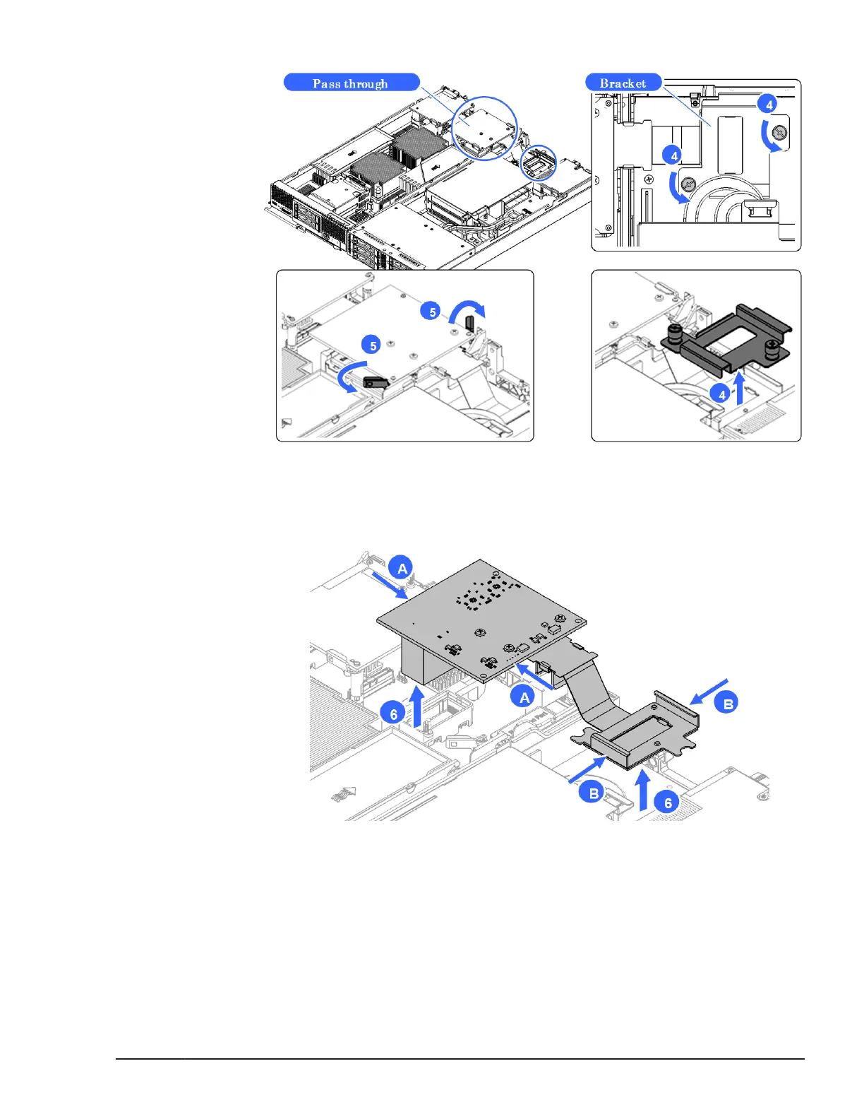 6. Grab the pass through mezzanine card shown as arrows A and B, then lift