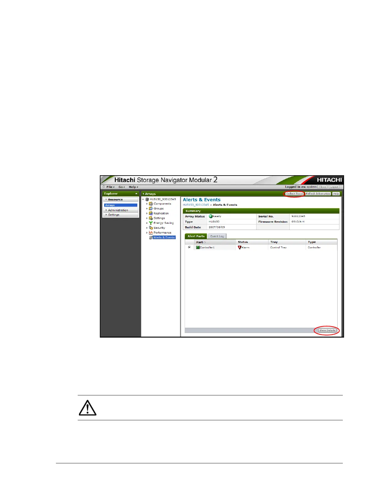 2. From the Alerts & Events window, click the Collect Trace button in the