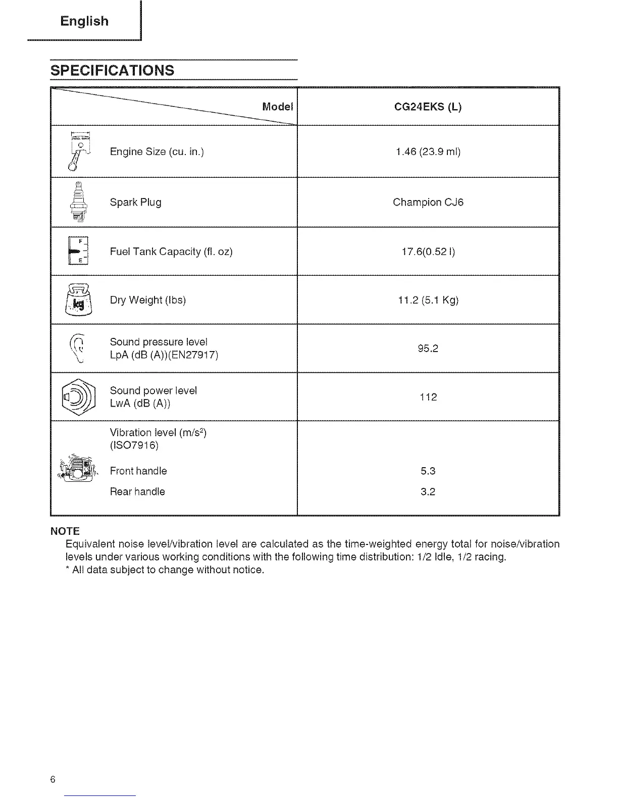 levels under various working conditions with the following time distribution: 1/2 Idle, 1/2 racing.