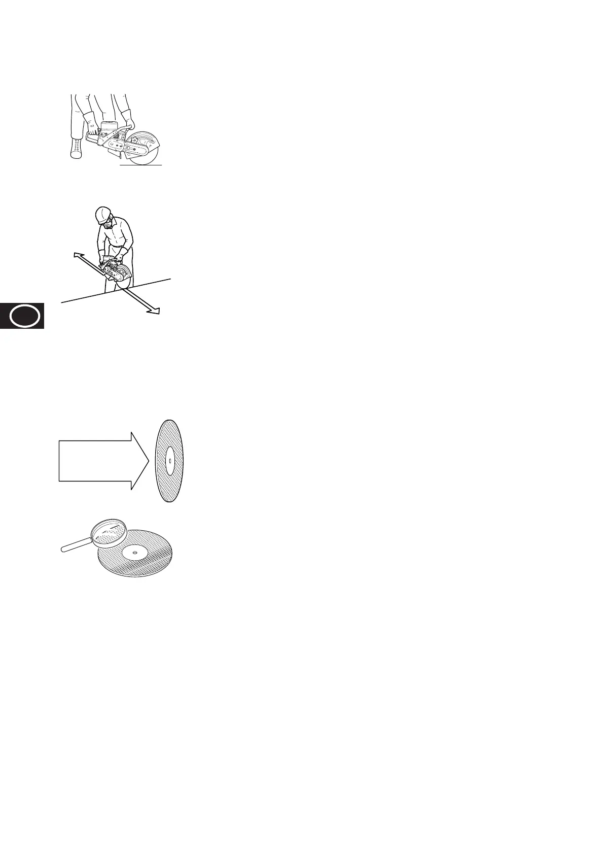 thrust of the rotating wheel pulls it away from you. Never operate the cutter