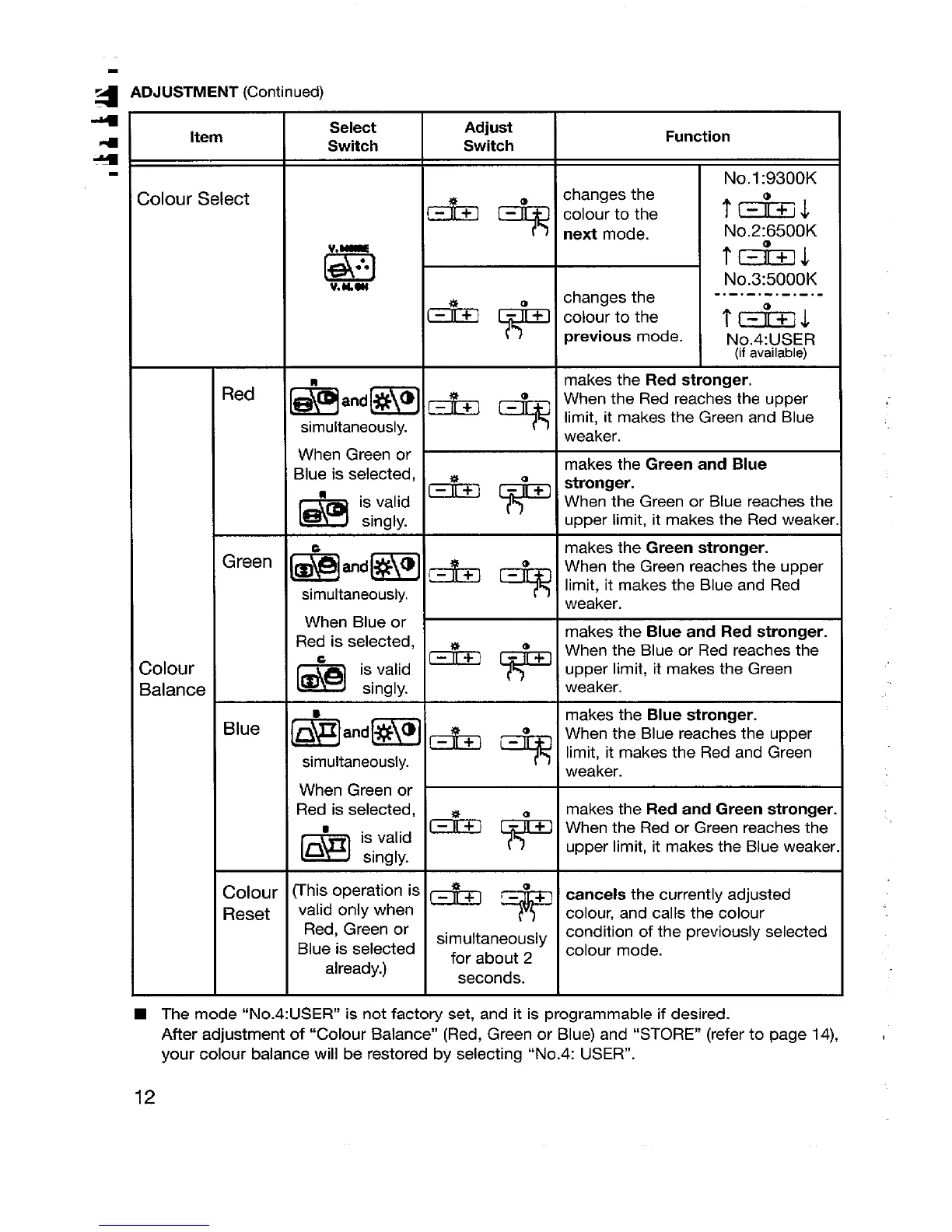 After adjustment of “Colour Balance” (Red, Green or Blue) and “STORE” (refer to page 14),