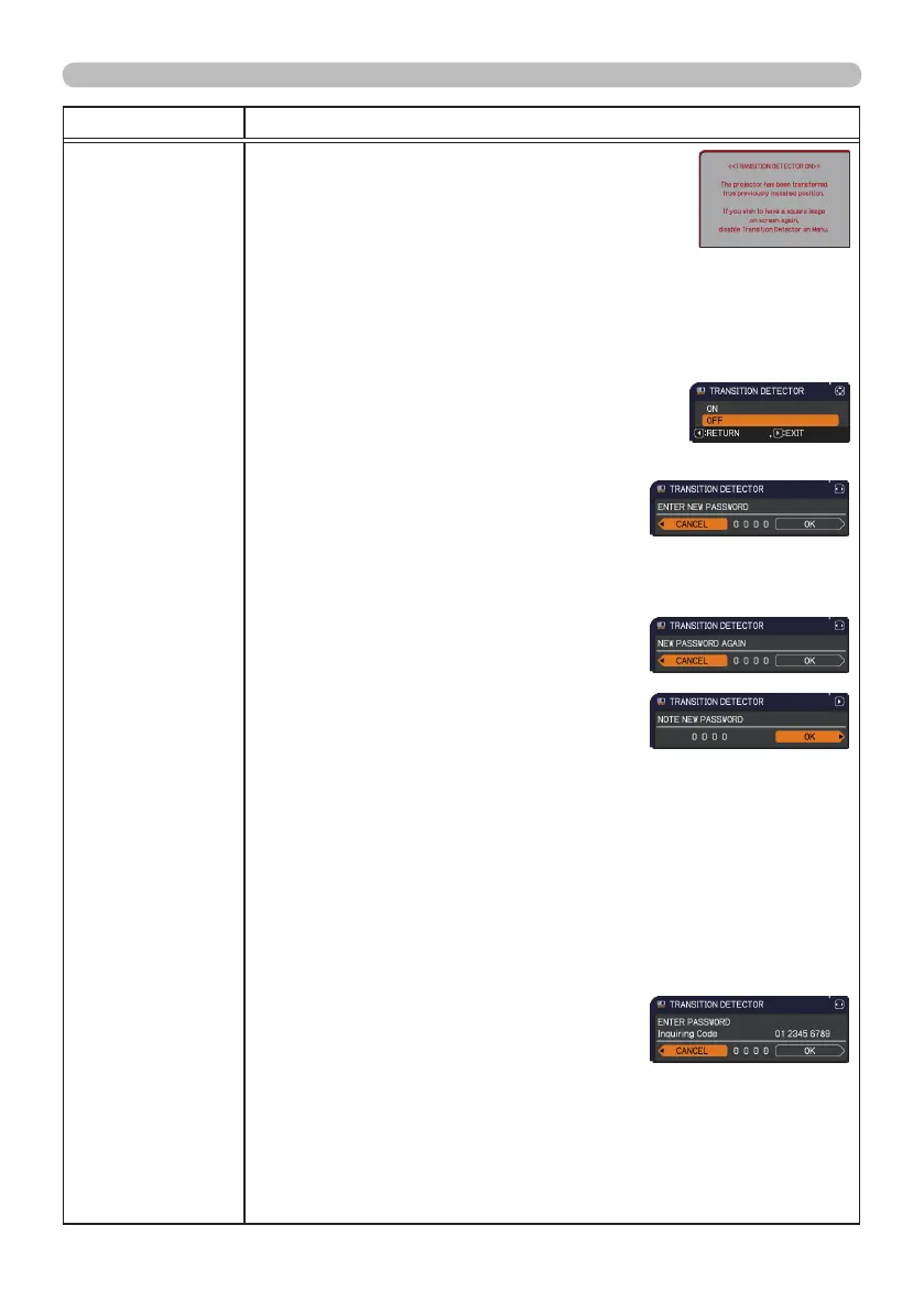 projector will return to the TRANSITION DETECTOR on/off menu.