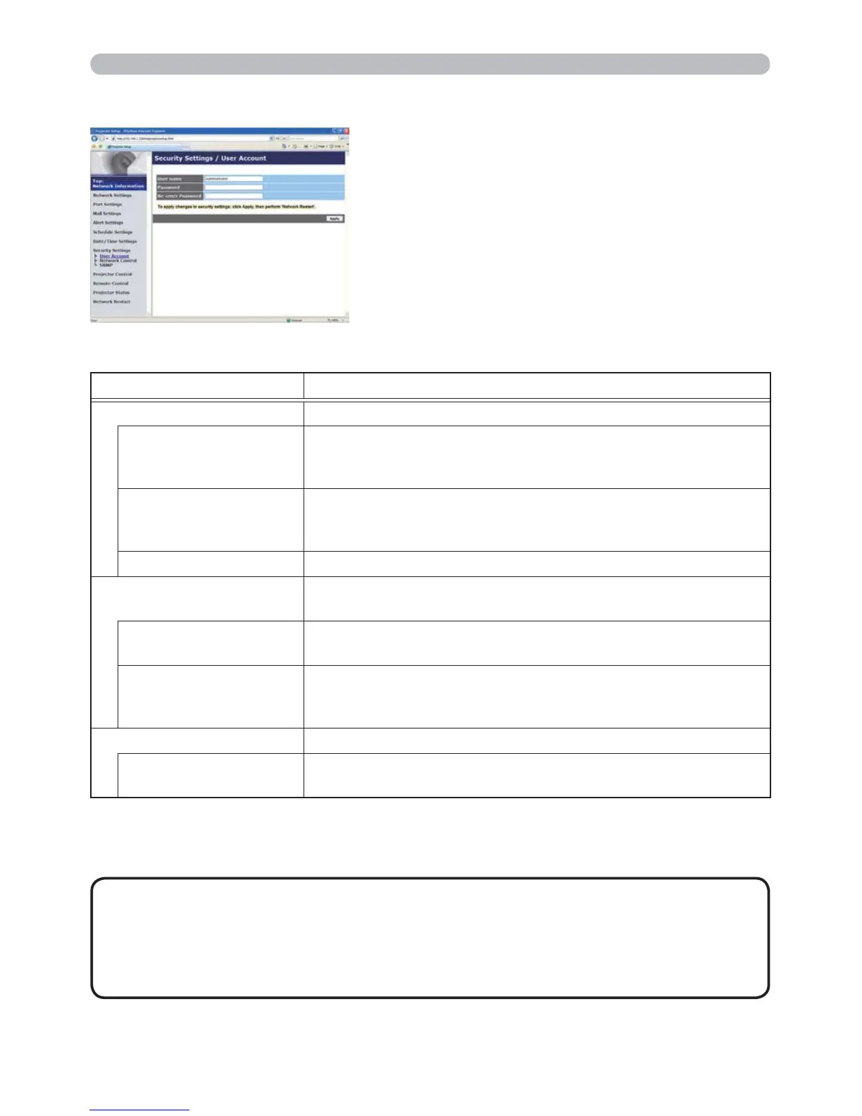 User Account Configures the user name and password.
