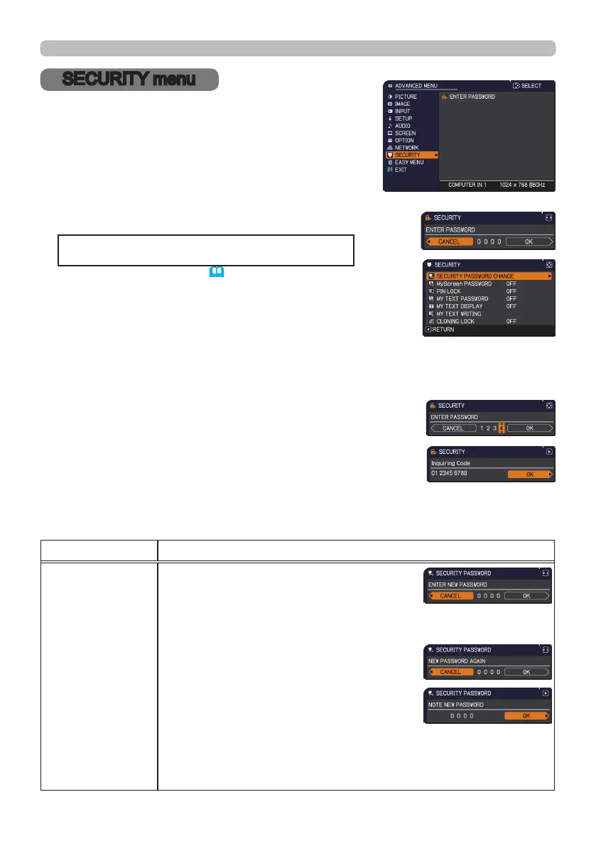 From the SECURITY menu, items shown in the table