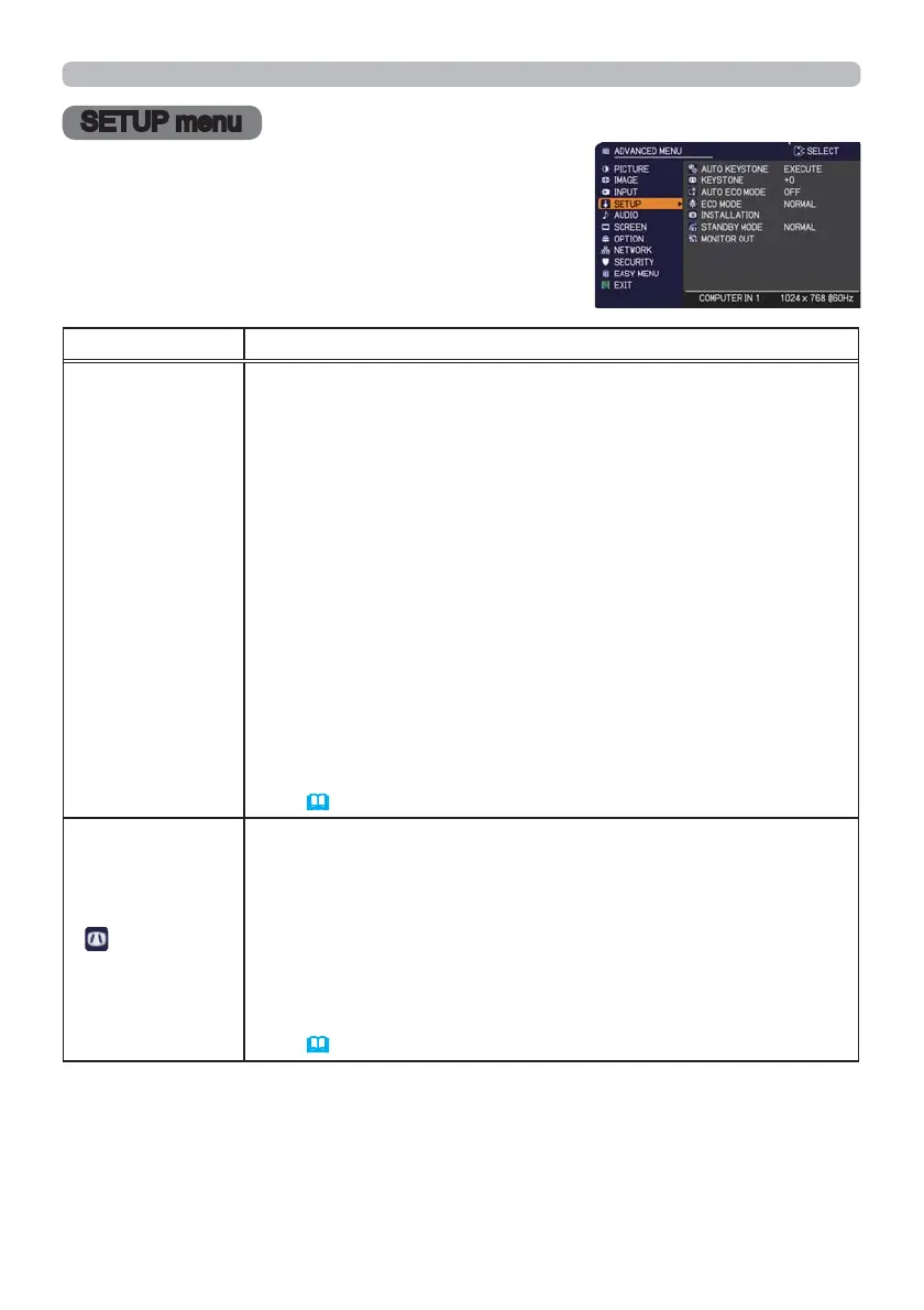 From the SETUP menu, items shown in the table