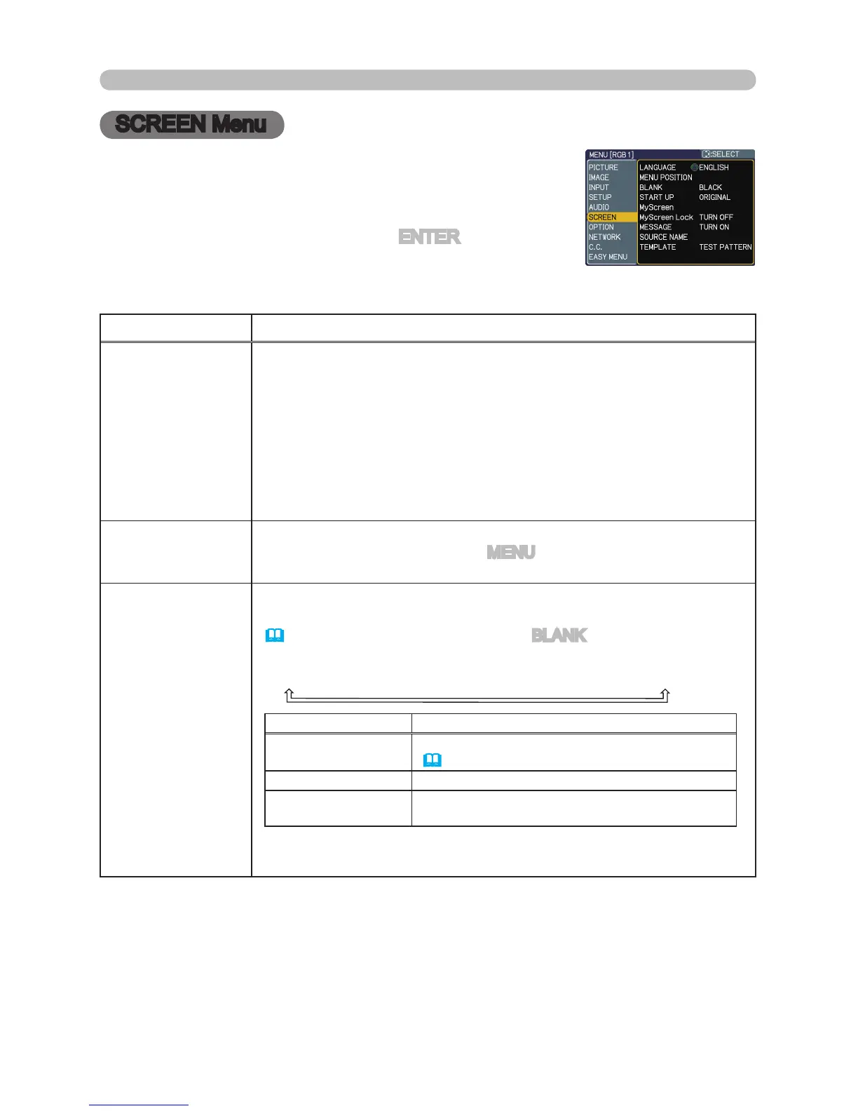 From the SCREEN Menu, items shown in the table below