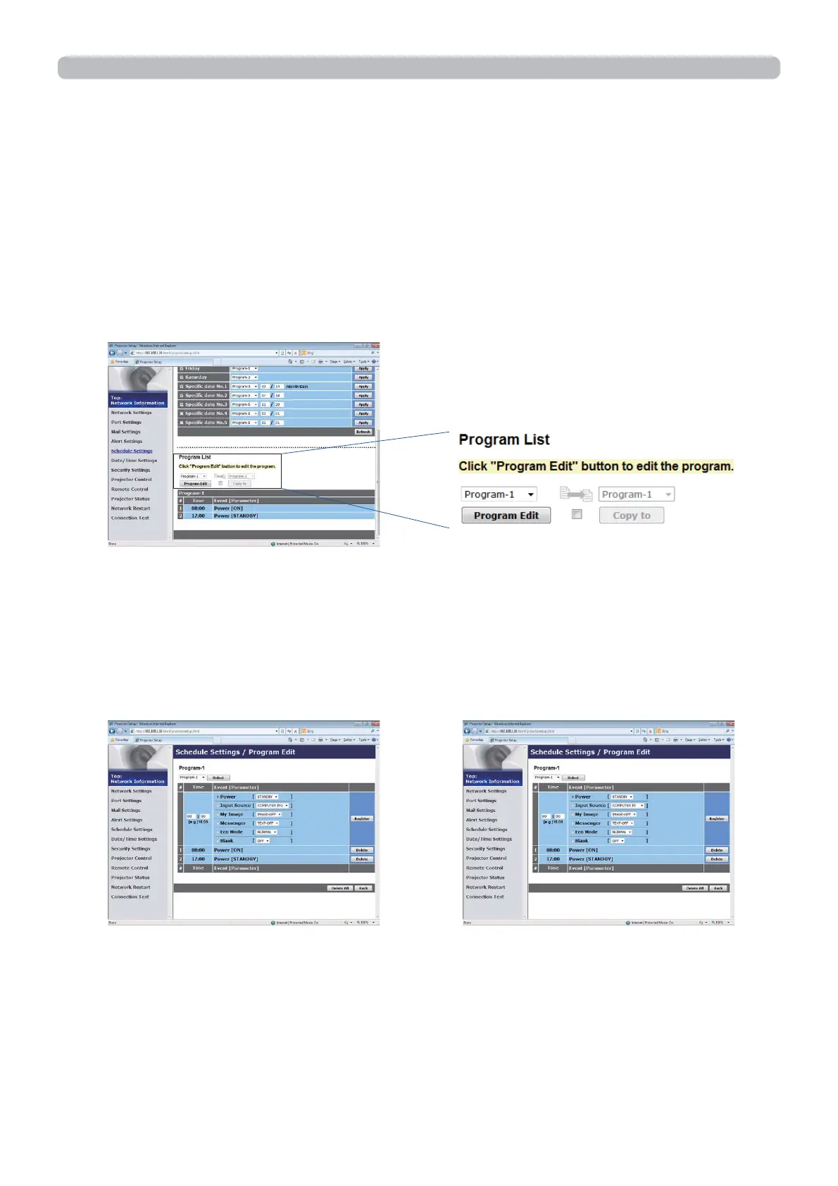 1) Select [Schedule Settings] on main menu in Projector Web Control.