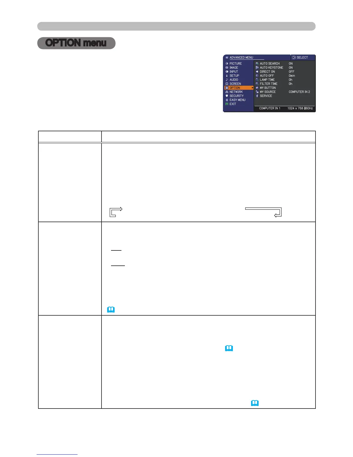 From the OPTION menu, items shown in the table
