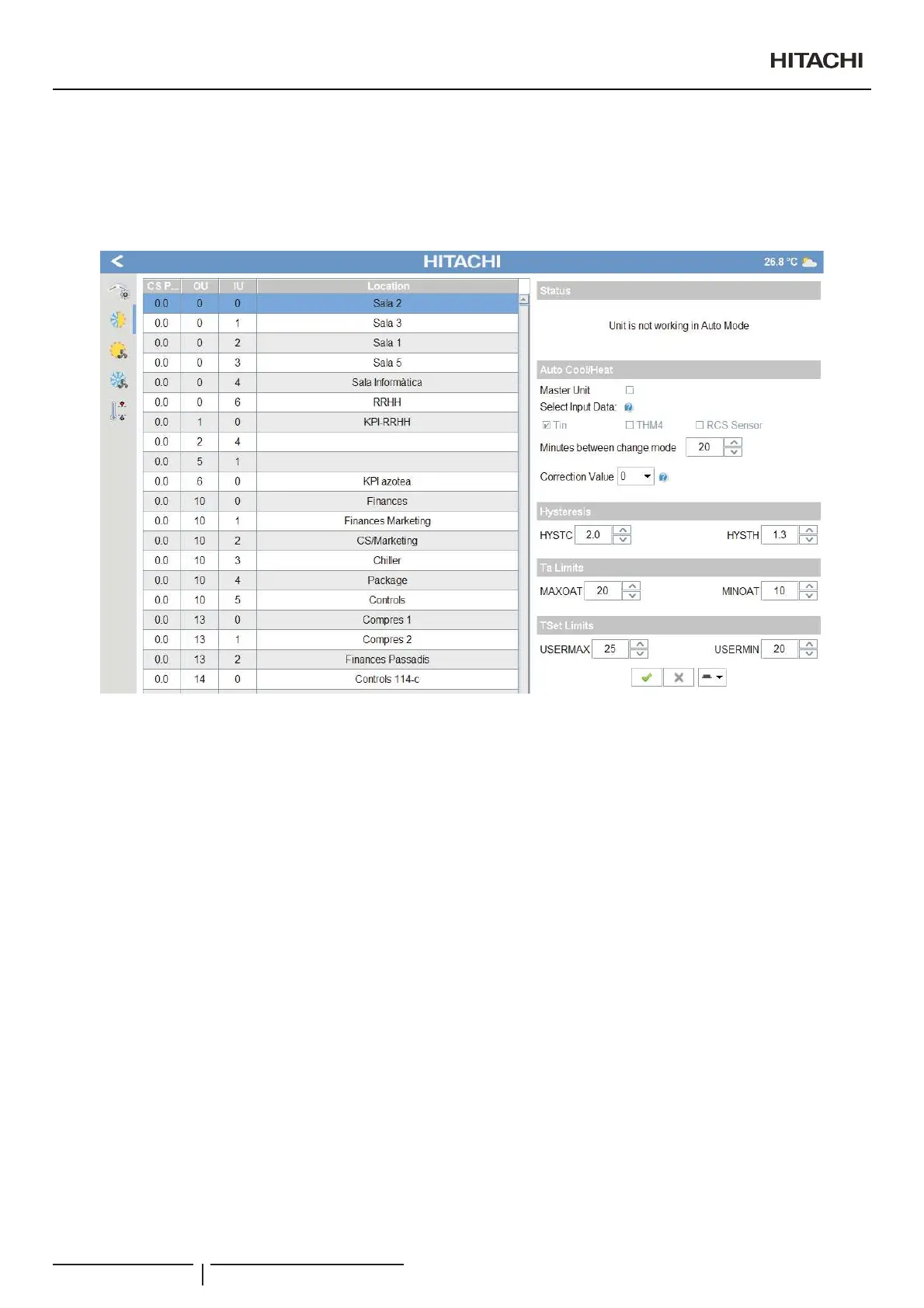 The Auto Cool/Heat panel shown corresponds to the cooling circuit of the indoor unit selected in the table of indoor units, as shown