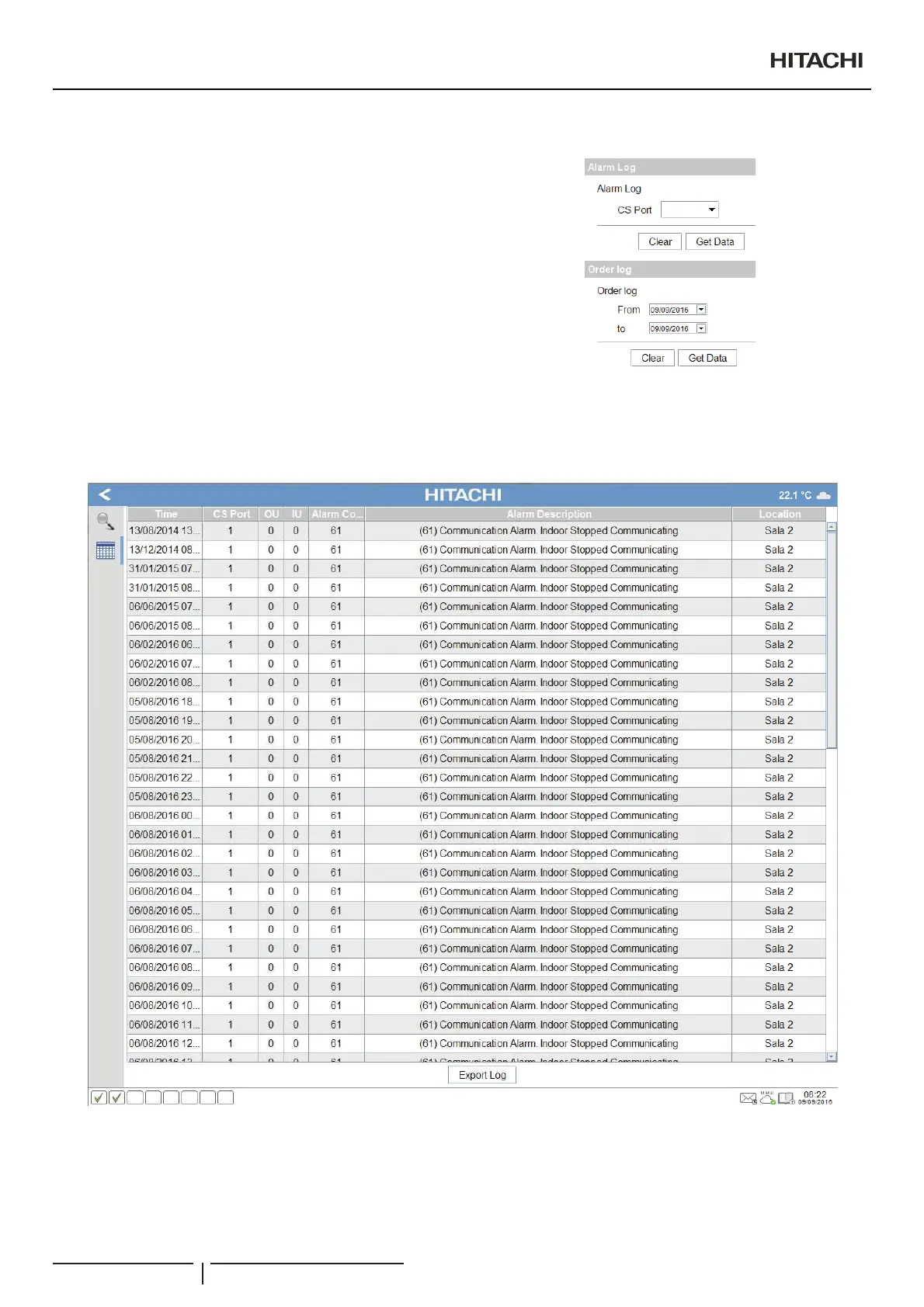 To visualize the alarms, click on the Alarm Log tab, and next press the Export log button, which is in the centre bottom of the
