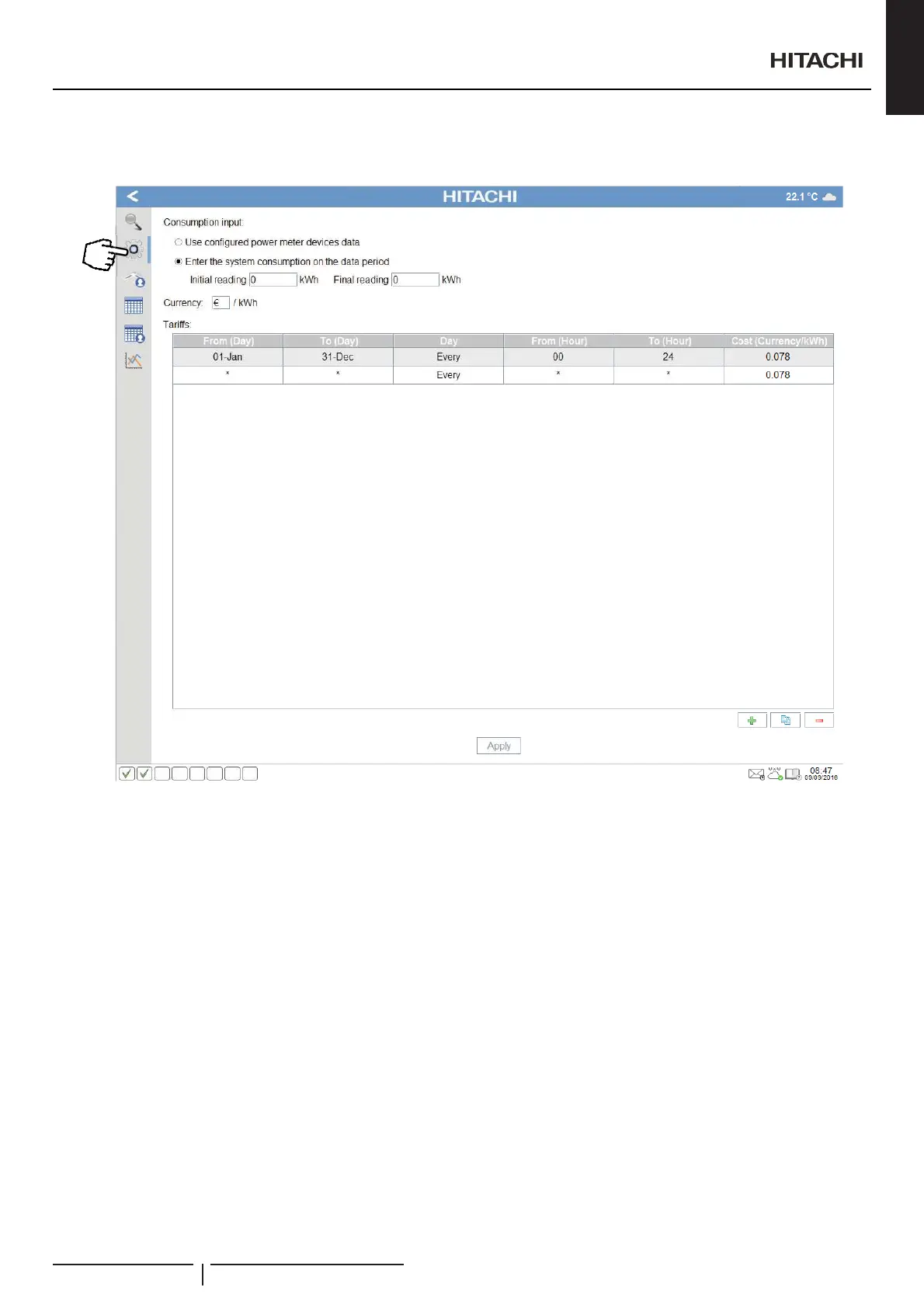 The tariff table lets the user to set different time periods within a day with a related cost.