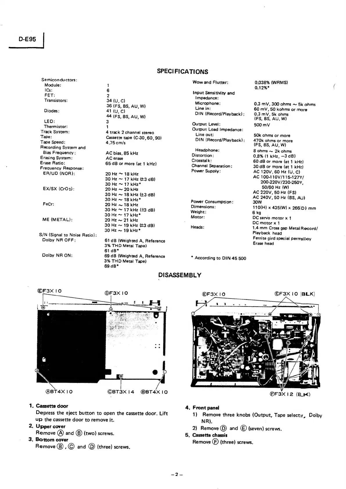 Hitachi D-E95 - SPECIFICATIONS; General Specifications; DISASSEMBLY; Step-by-step disassembly instructions