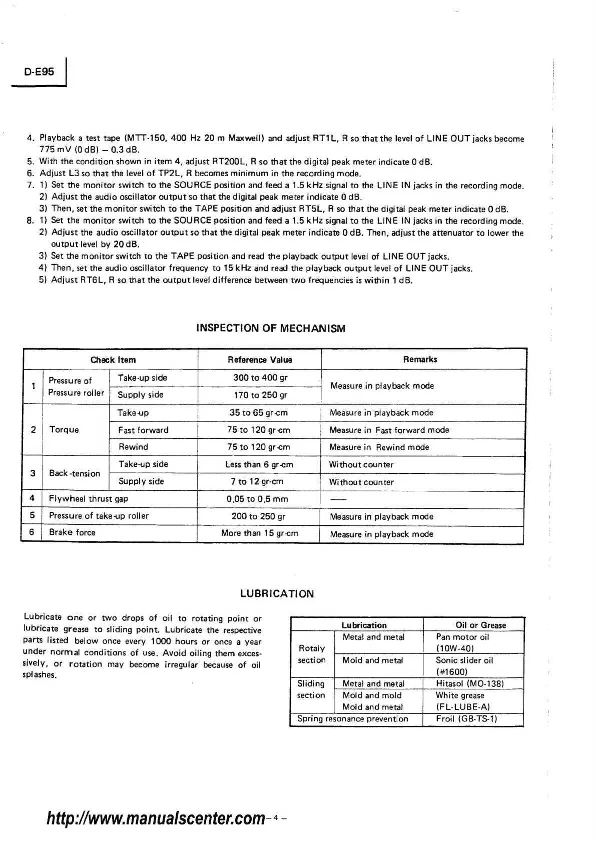 Hitachi D-E95 - INSPECTION OF MECHANISM; Mechanical Inspection Checks; LUBRICATION; Lubrication Points and Materials