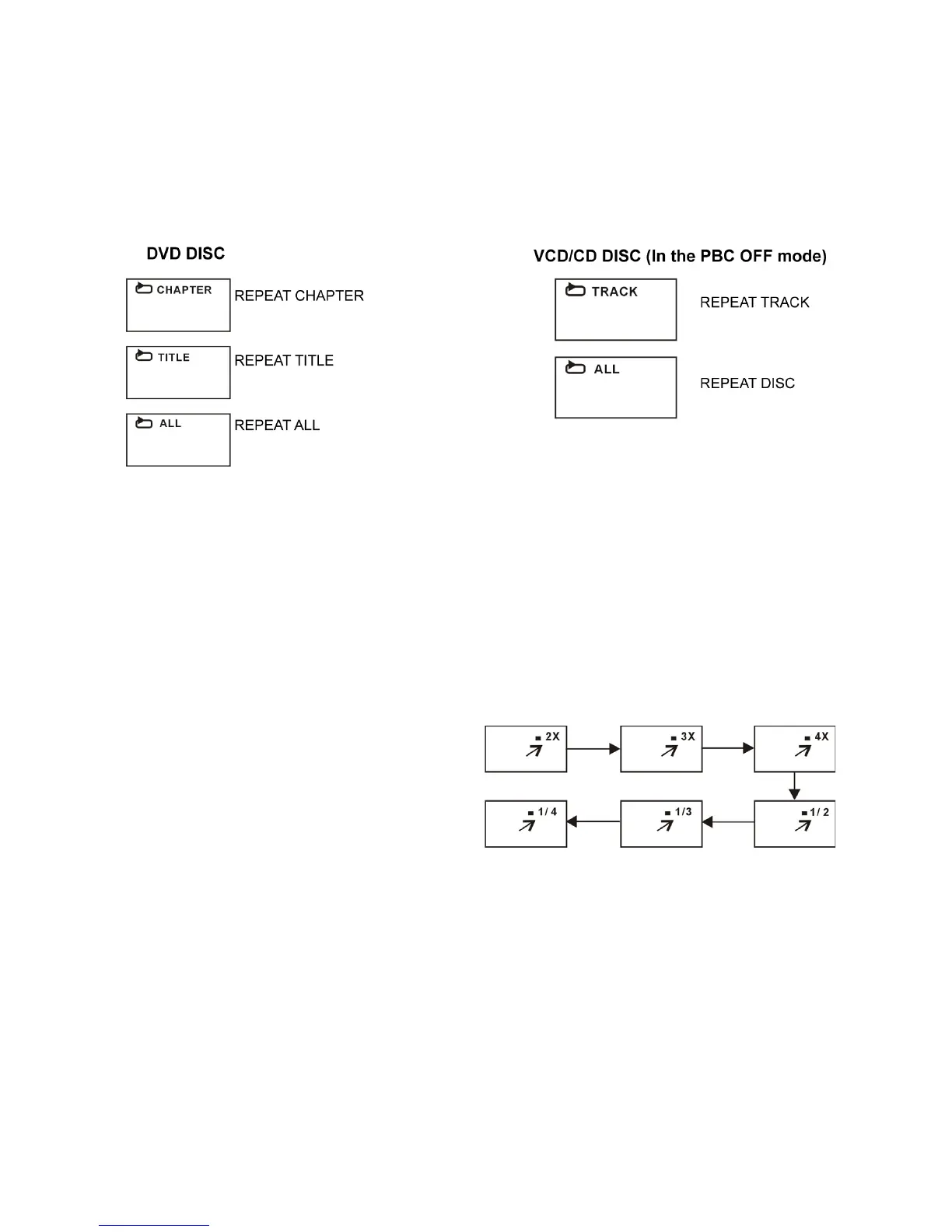 one title (for DVD disc), or repeat play the track (for VCD/CD).