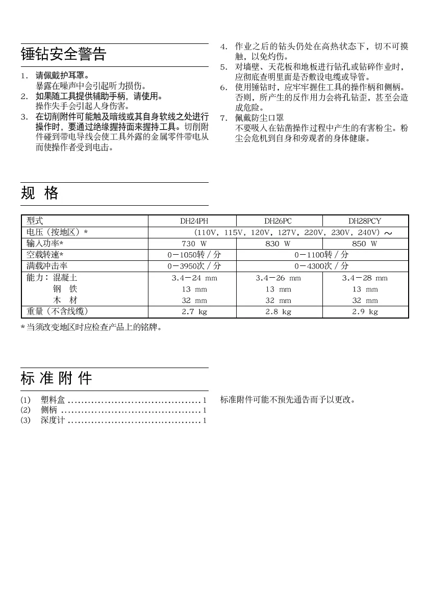 Hitachi DH24PH - Rotary Hammer Safety Warnings; Specifications; Standard Accessories