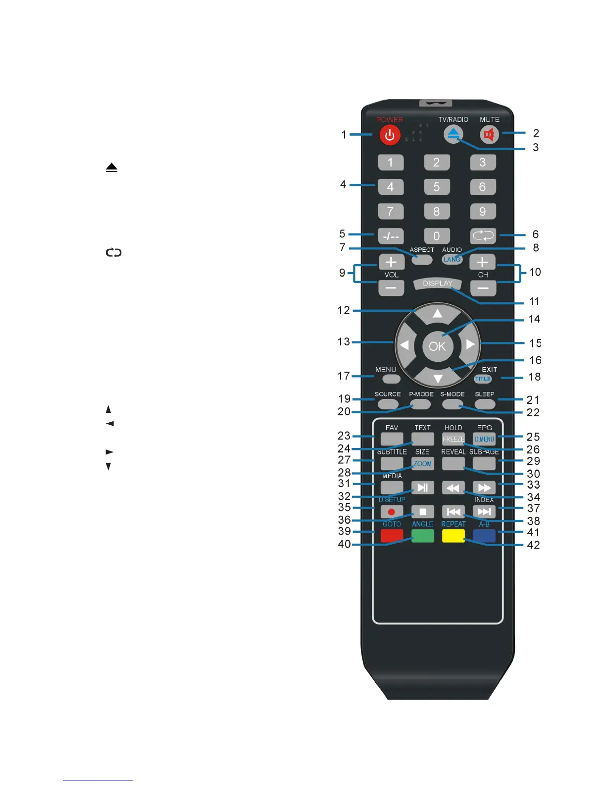 18 EXIT: Exit the menu page (TV).