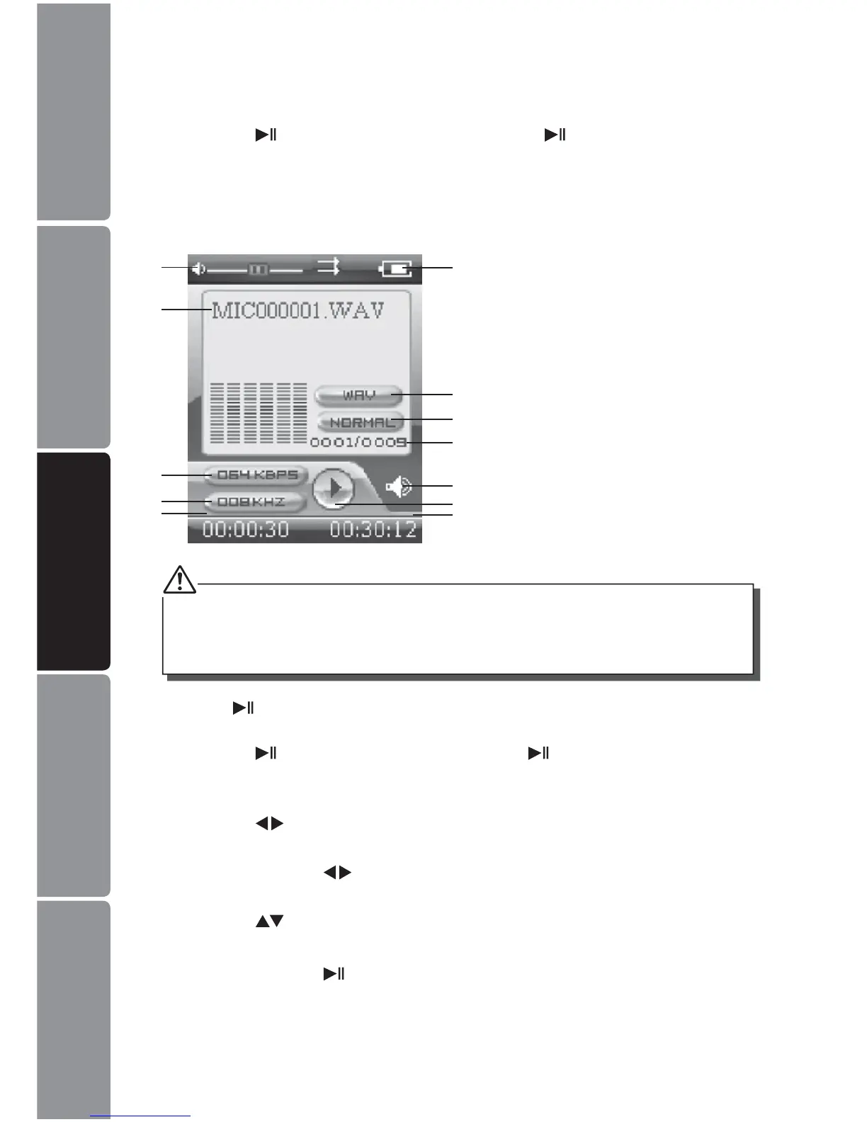 The recorded les are saved in the MICIN.DIR folder of the MP3 player as WAV les (format: