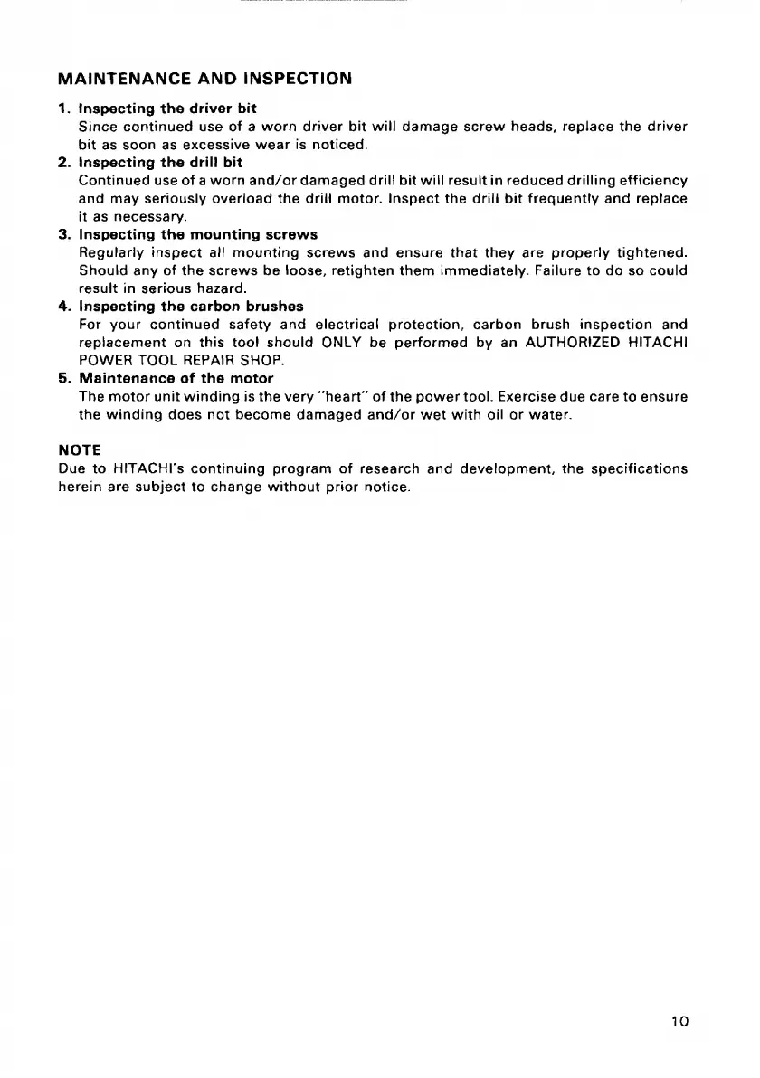 Hitachi DV 20V2 - Hammer Drill Maintenance and Inspection; Bit and Screw Inspection; Carbon Brush and Motor Care