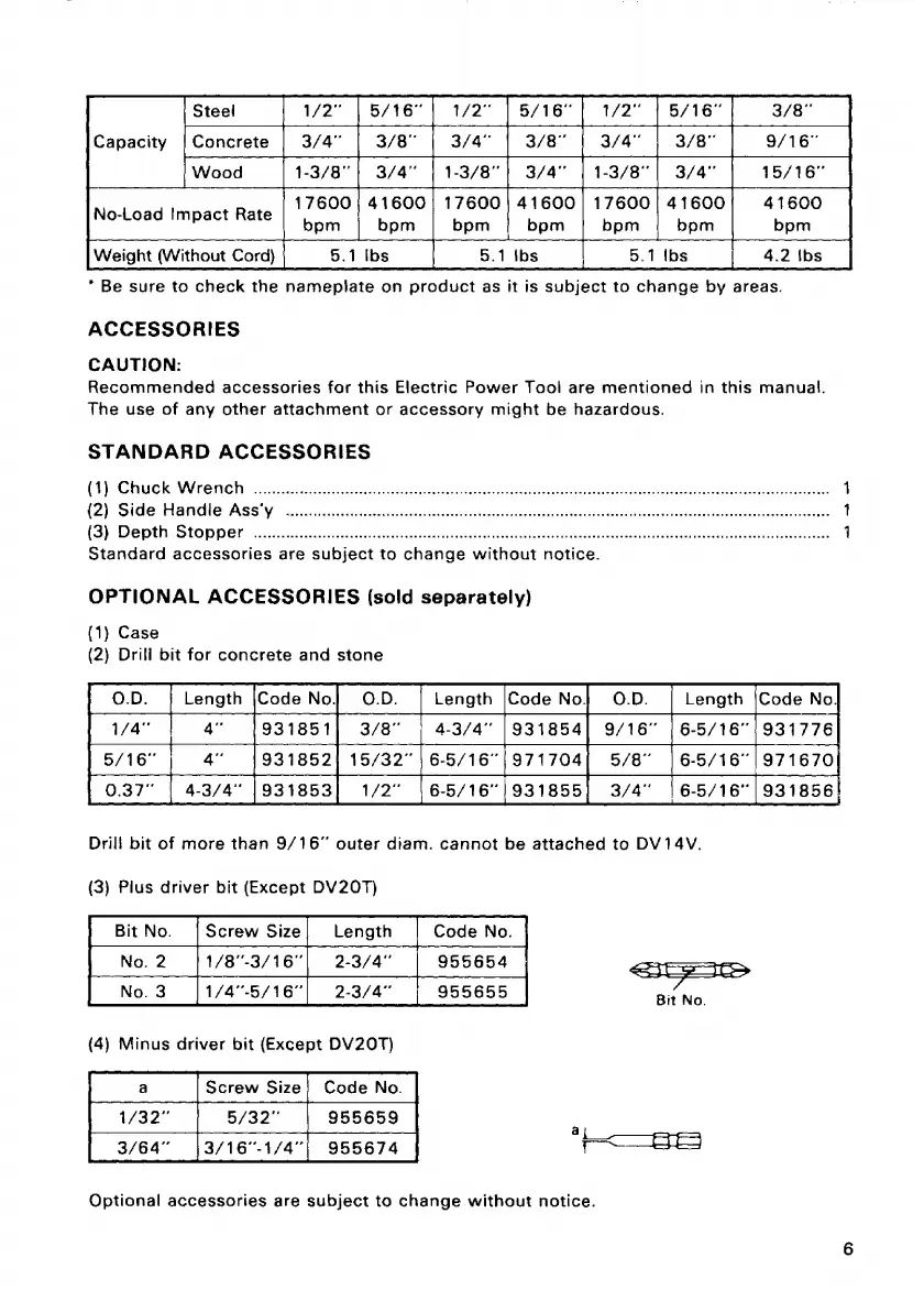 Hitachi DV 20V3 - Accessories; Standard Accessories; Optional Accessories