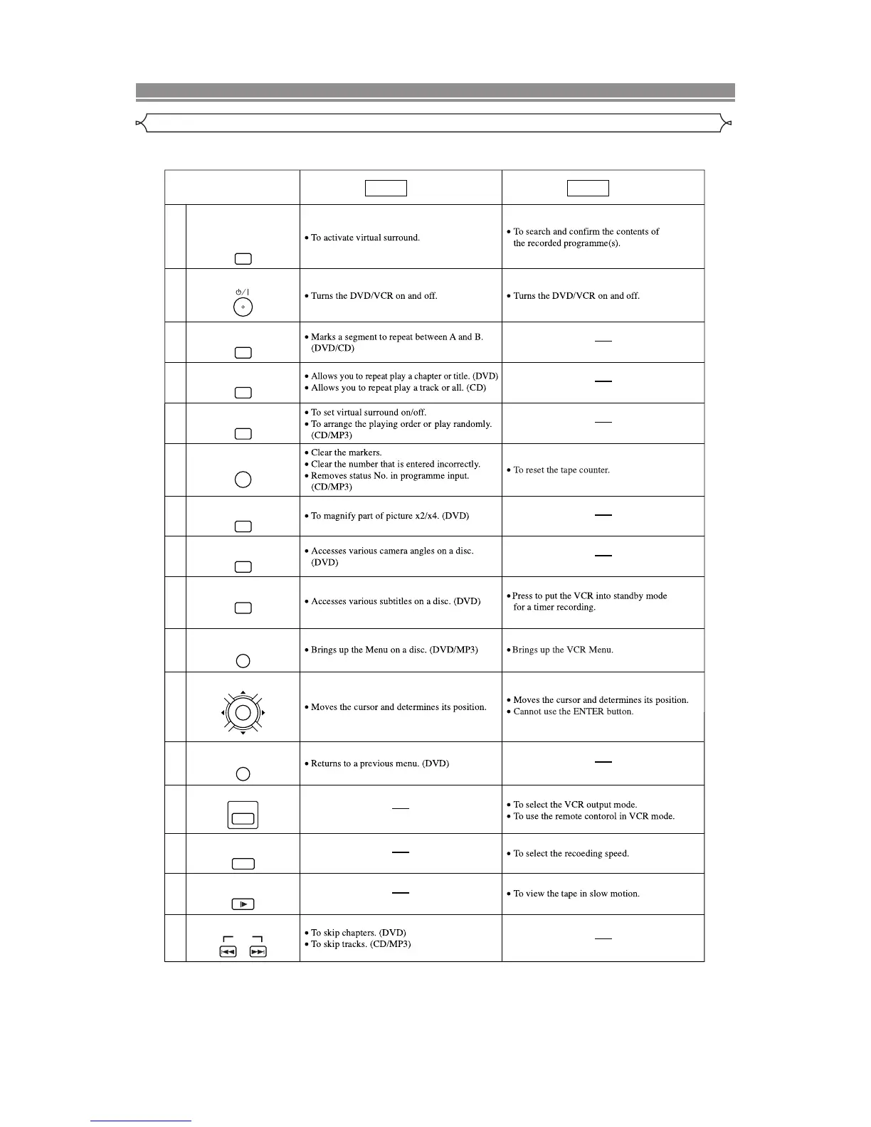 Buttons on remote controller work in different ways for DVD, Audio CD, MP3 and VCR: