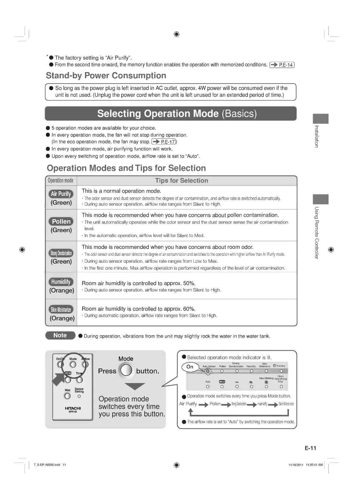 Hitachi EP-A6000 - Remote Controller Operation (Continued); Airflow Rate Adjustment