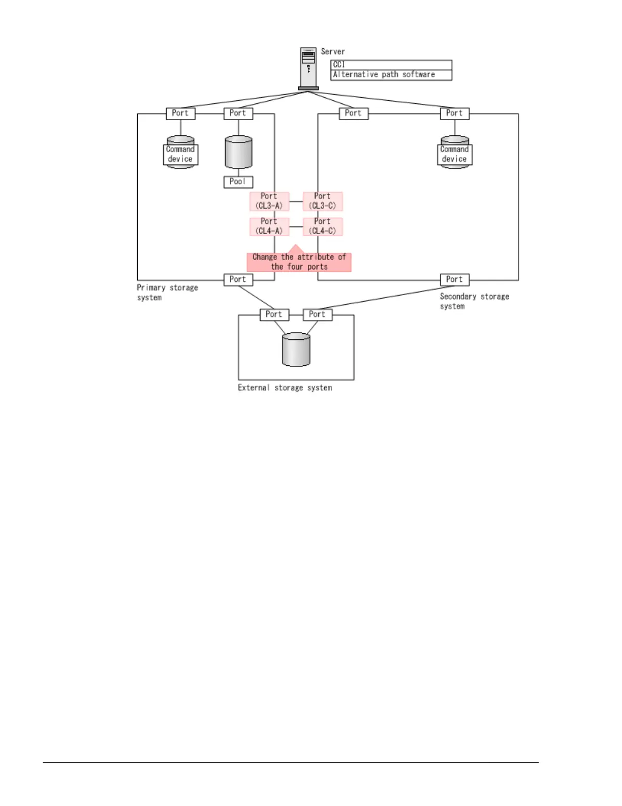 4. Change the attribute of port (CL4-C) on the secondary storage system to