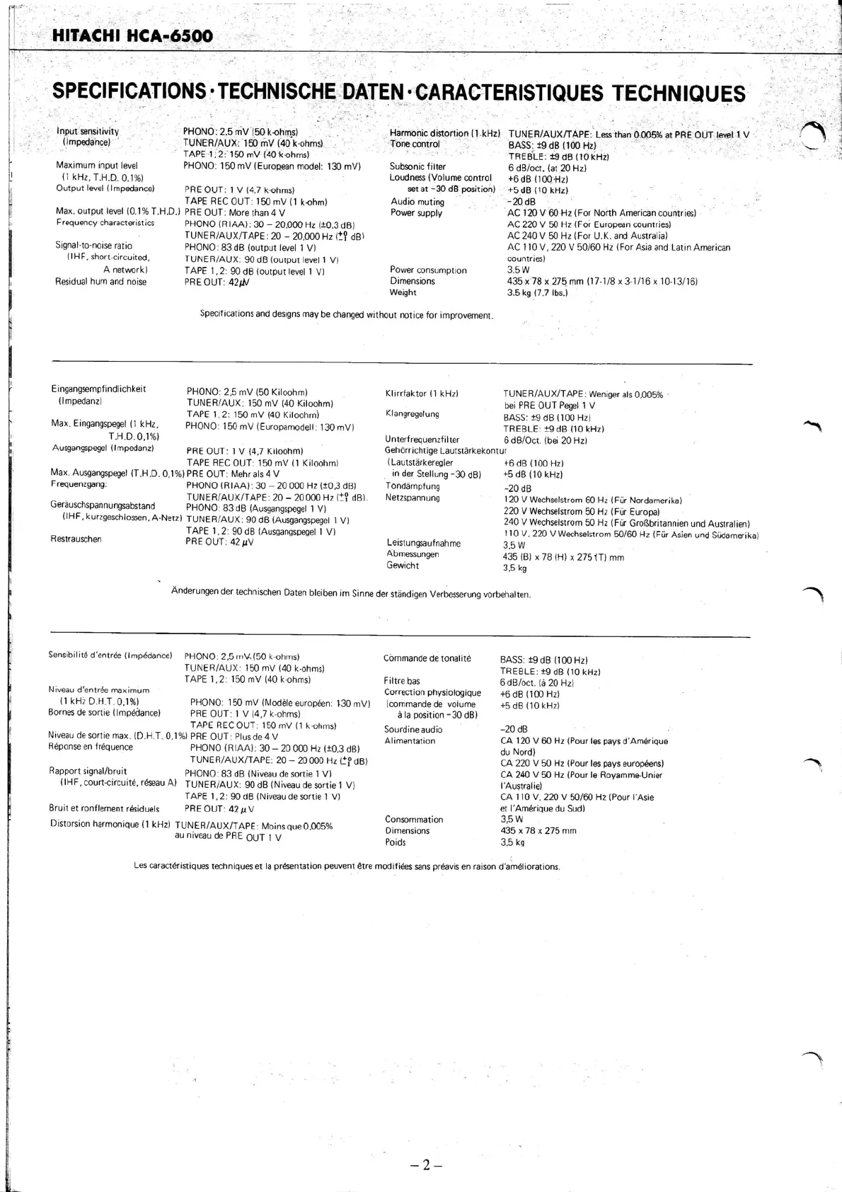 Hitachi HCA-6500 - Hitachi HCA-6500 Technical Specifications; Input Sensitivity and Output Levels; Frequency Response and Noise Specifications