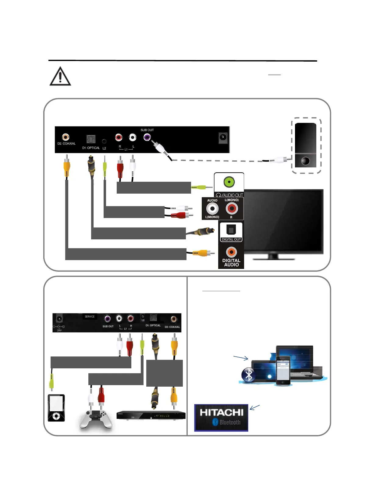 CAUTION: Lower the volume on television, source device and Sound