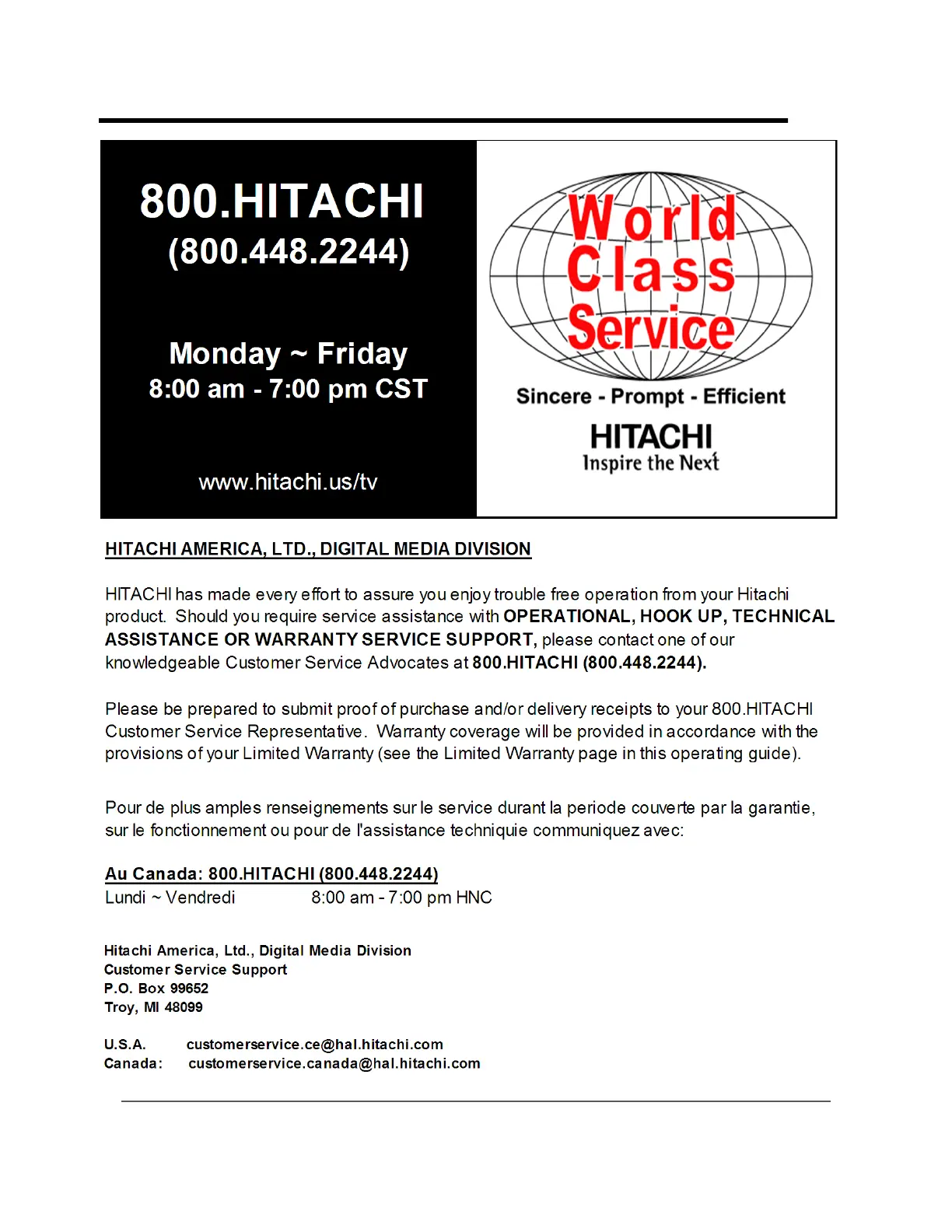 Hitachi HSB40B16 - Customer Support; Customer Support and Warranty Service