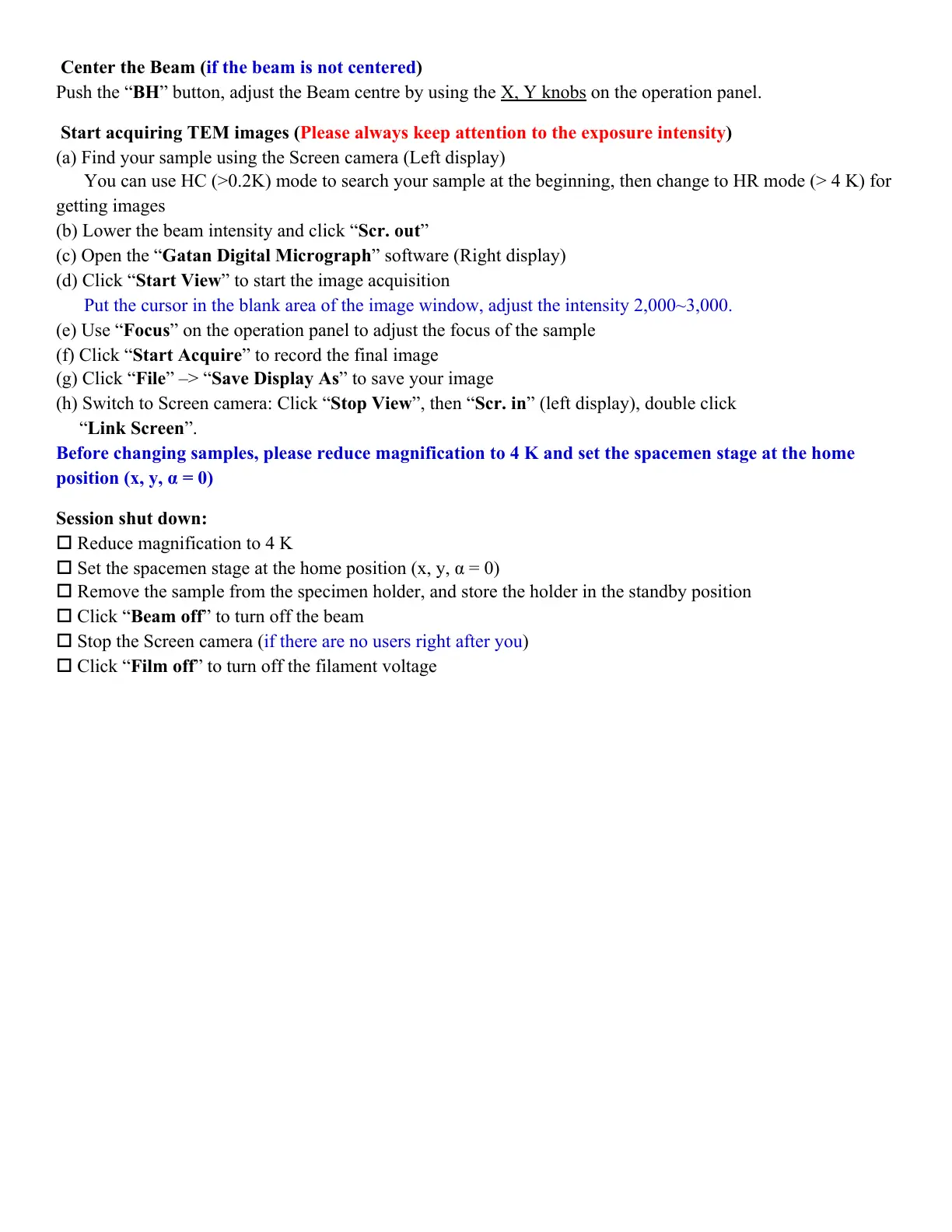 Before changing samples, please reduce magnification to 4 K and set the spacemen stage at the home