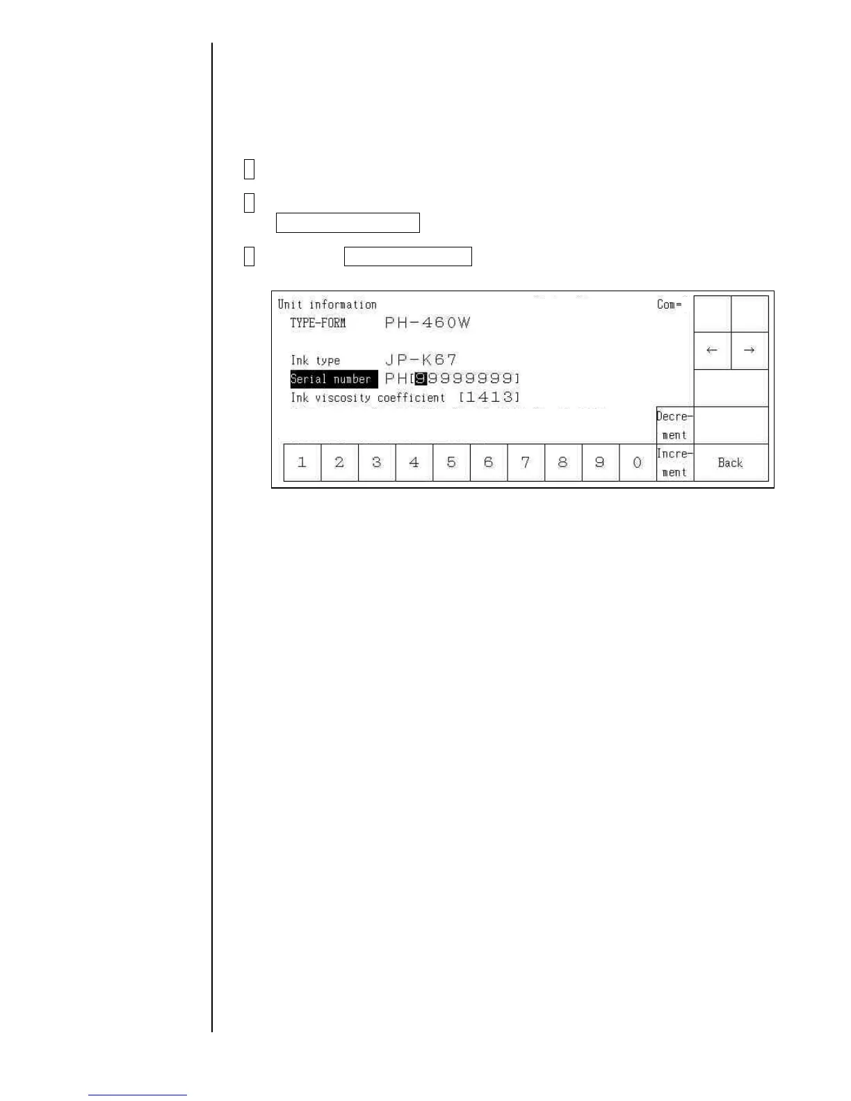 - Indicate the unit Type-Form, Ink type, Serial number and Ink viscosity coefficient.