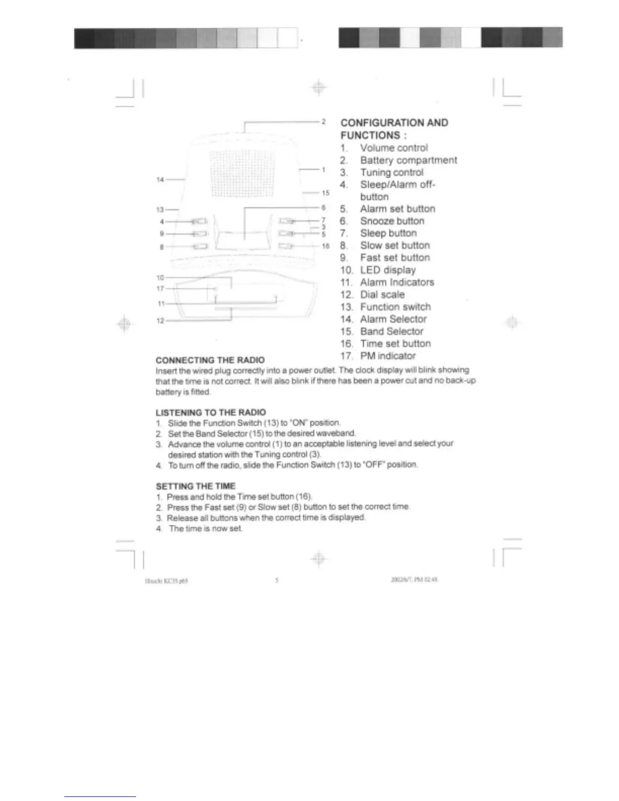 Hitachi KC35 - Device Configuration and Operation; Component Identification; Connecting and Operating the Radio; Setting the Time