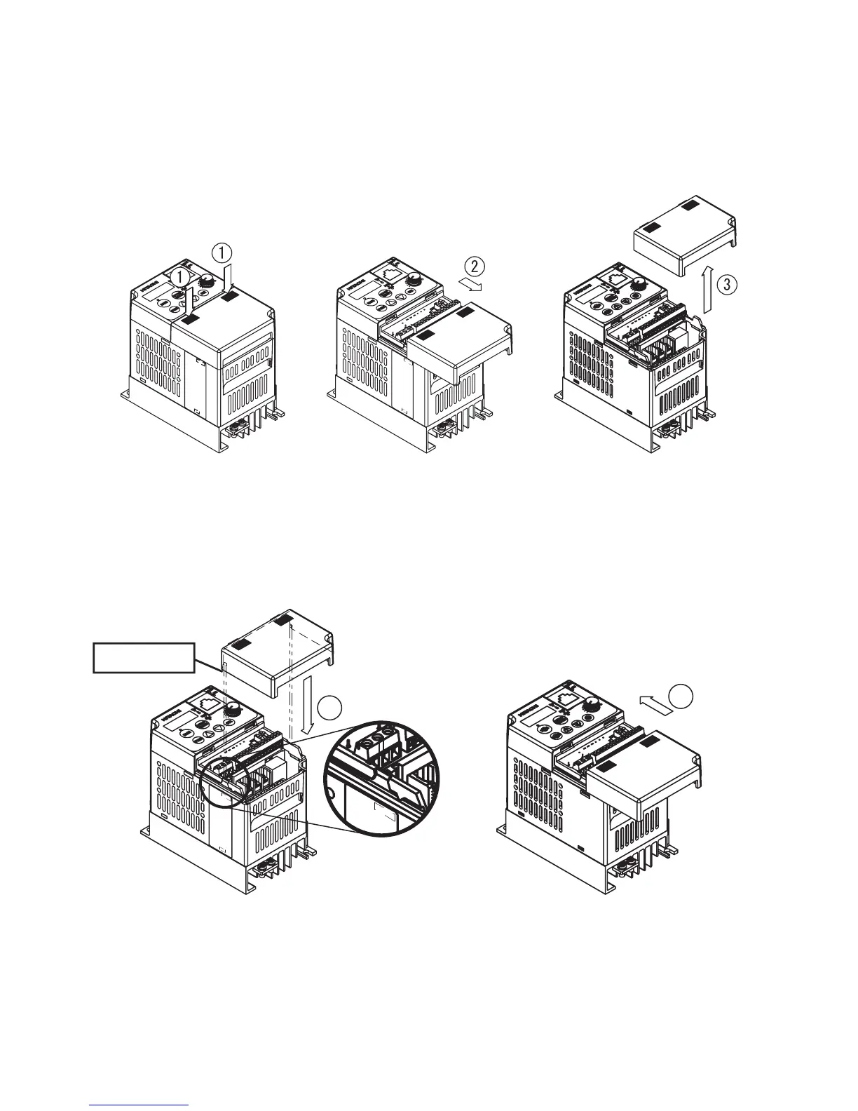 Note: The example inverter in the diagrams is model L200-004LFU. The cover removal or installation method is the same for the other models.