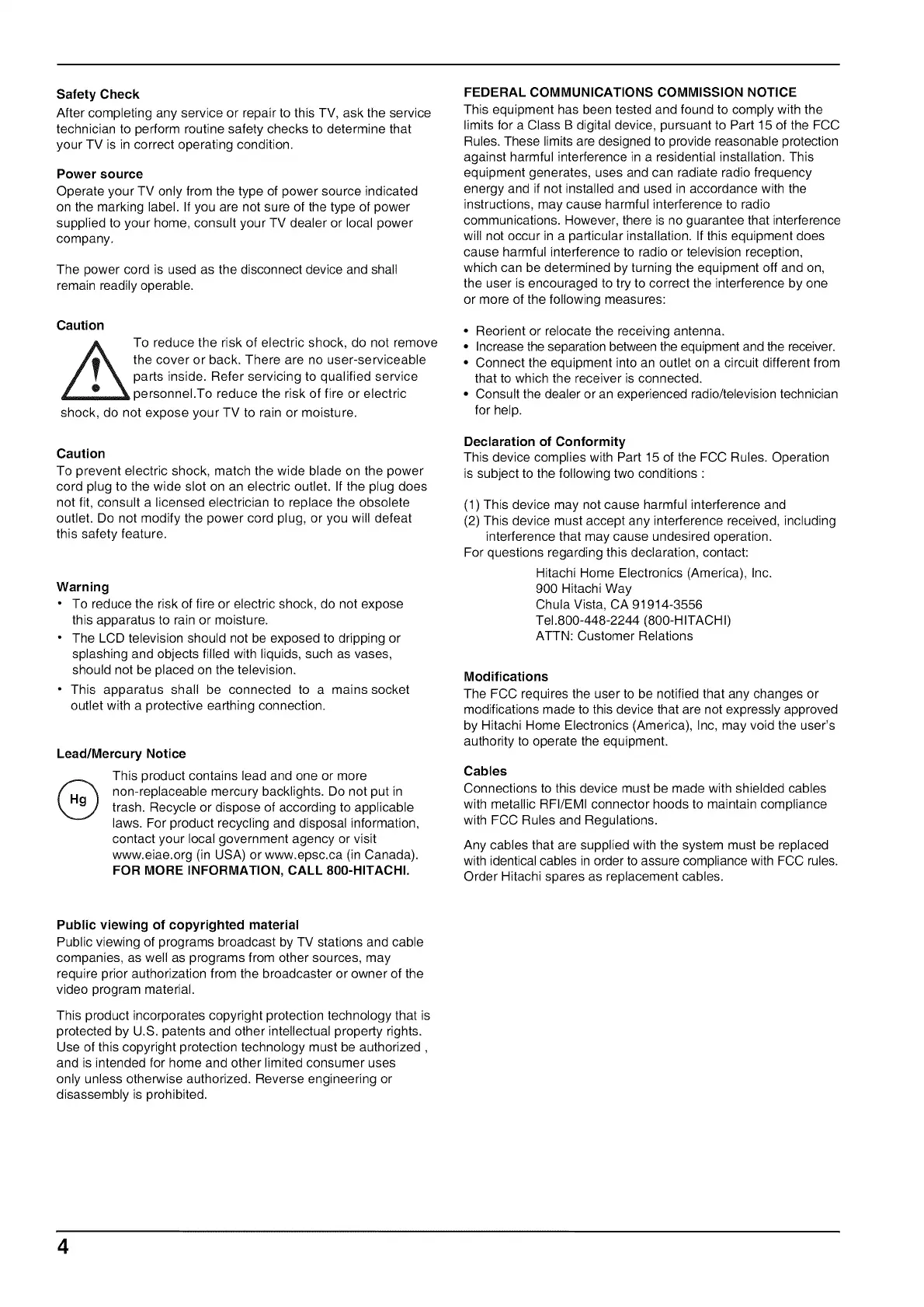 by Hitachi Home Electronics (America), Inc, may void the user's