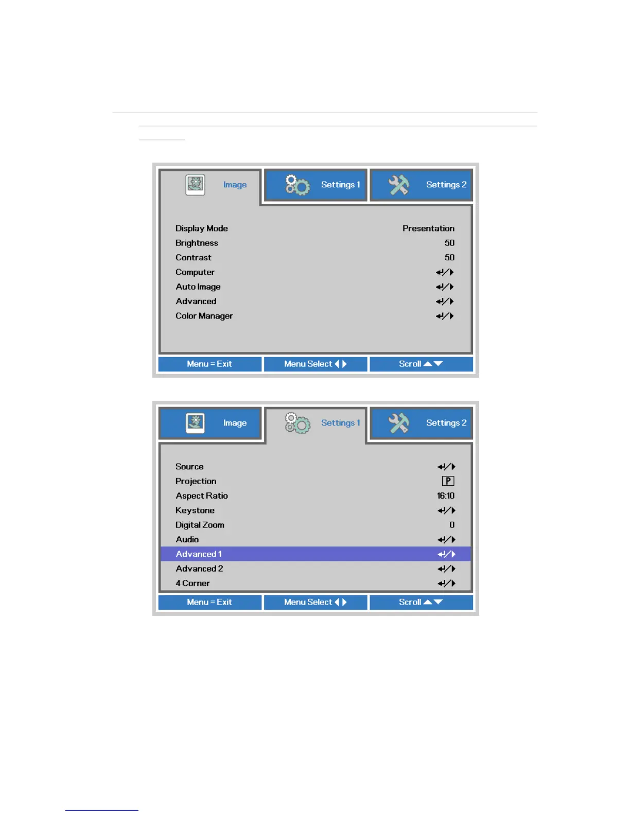 2. Press ◄► to move to the Settings 1 menu and press ▲▼ to select Advanced 1.