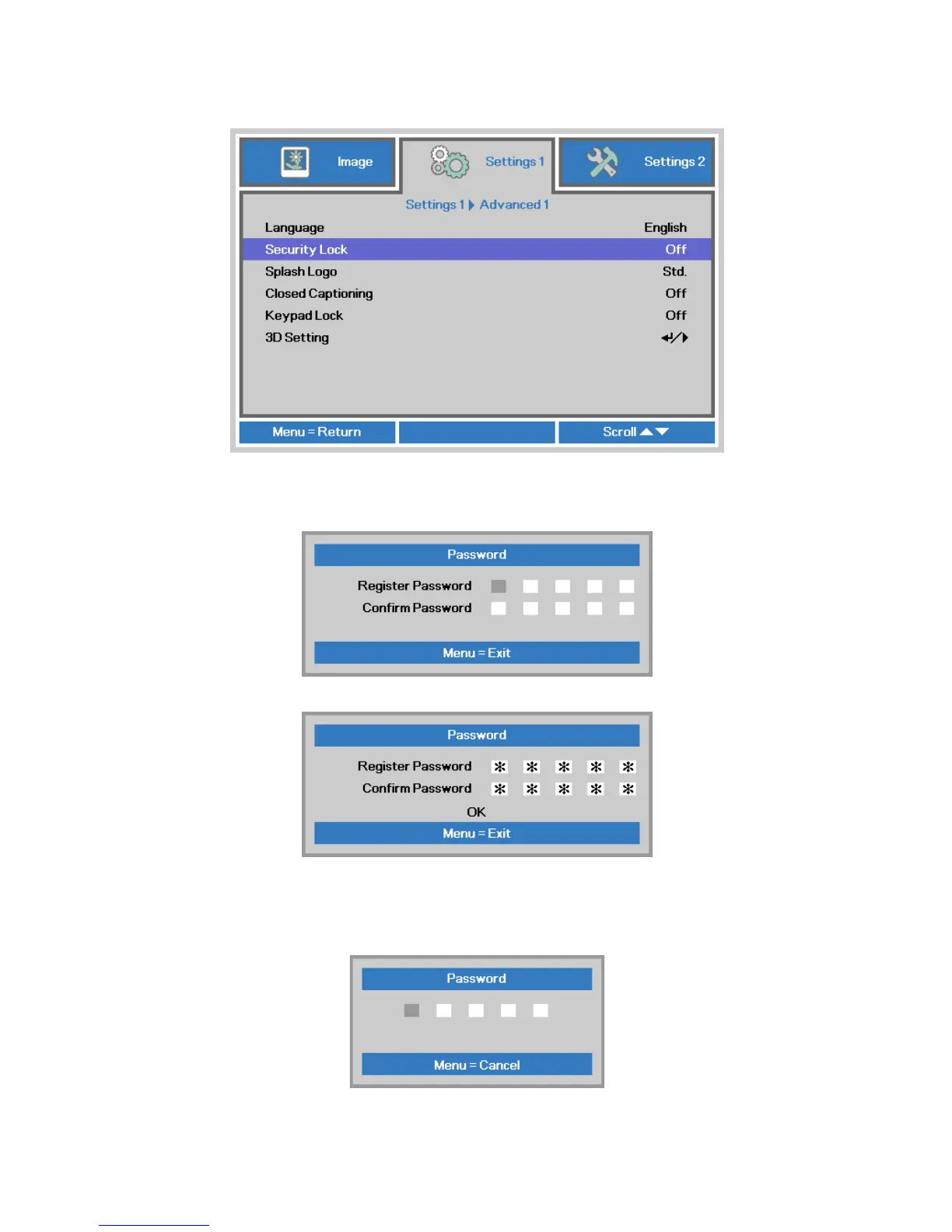 Press ▲▼◄► in any order to set the password. Push MENU button to exit the dialog box.