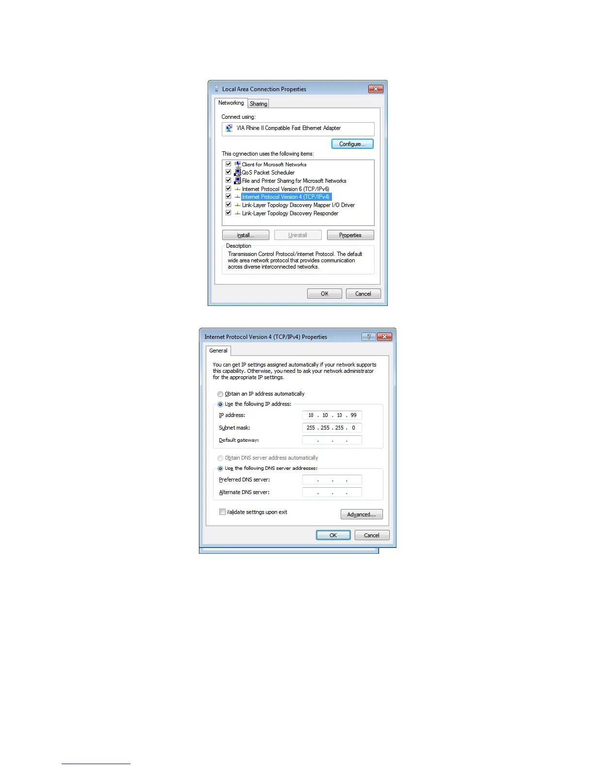 6. Click Use the following IP address and ll in the IP address and Subnet mask, then click OK.
