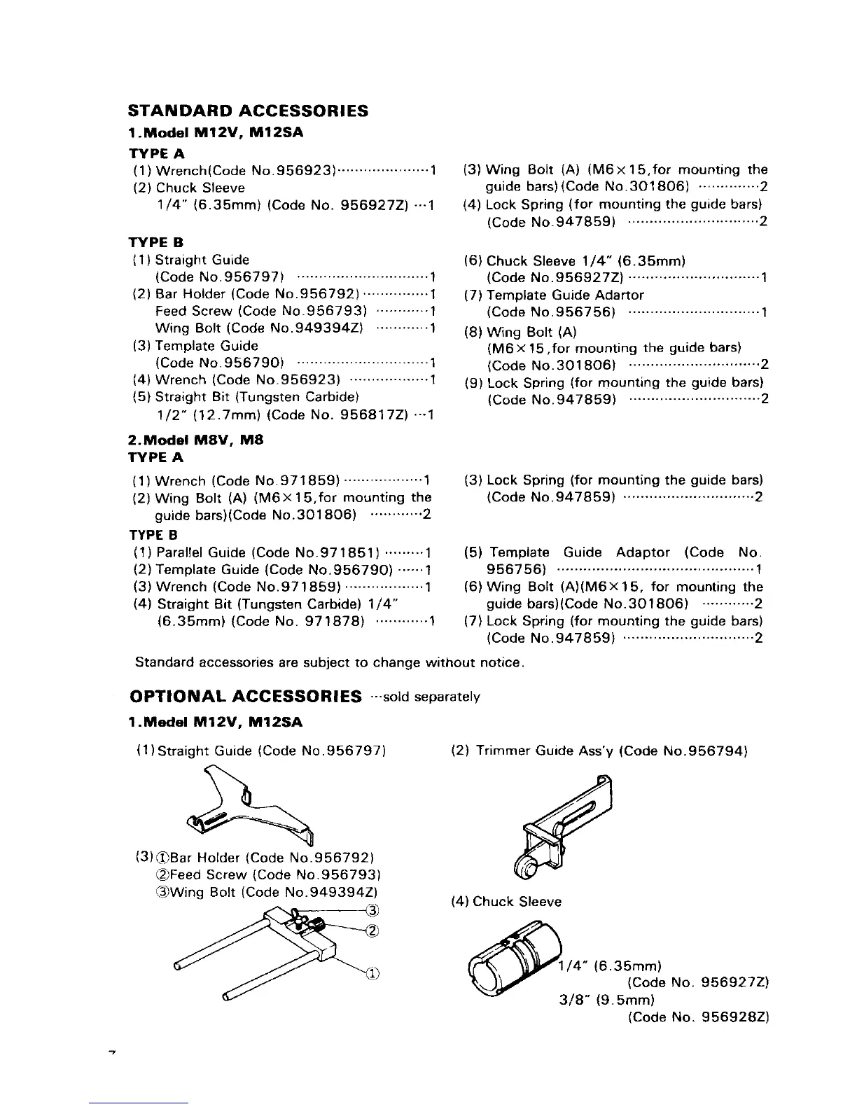 Hitachi M12SA - Accessory Information; Standard Accessories for Models; Optional Accessories for Models